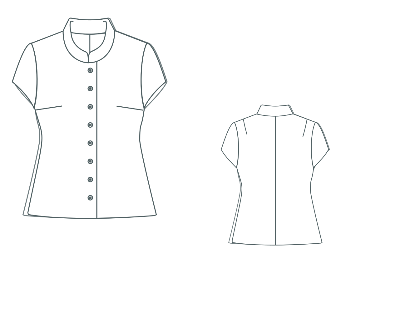This is a PDF (8.5x11) pattern file. Woven, loose-fitting, above high hip top with a round Mandarin collar, round neck, round jewel shoulder darts at the back, short and fitted sleeves.