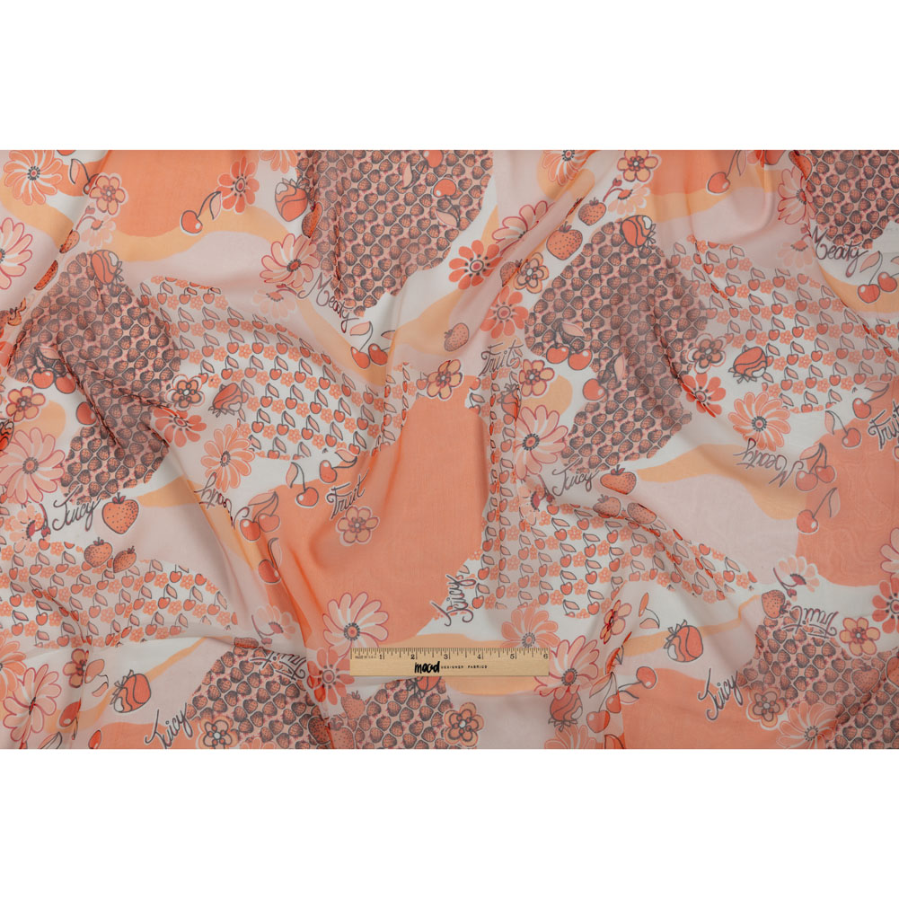 Let this Peach, Orange and White Juicy Fruits Silk Chiffon take you down to strawberry fields! Cherries, strawberries, and flowers float through waves of pink and peach colors, calling back to 60s styles.