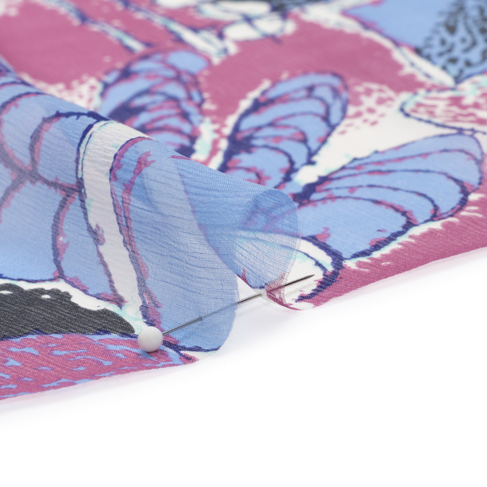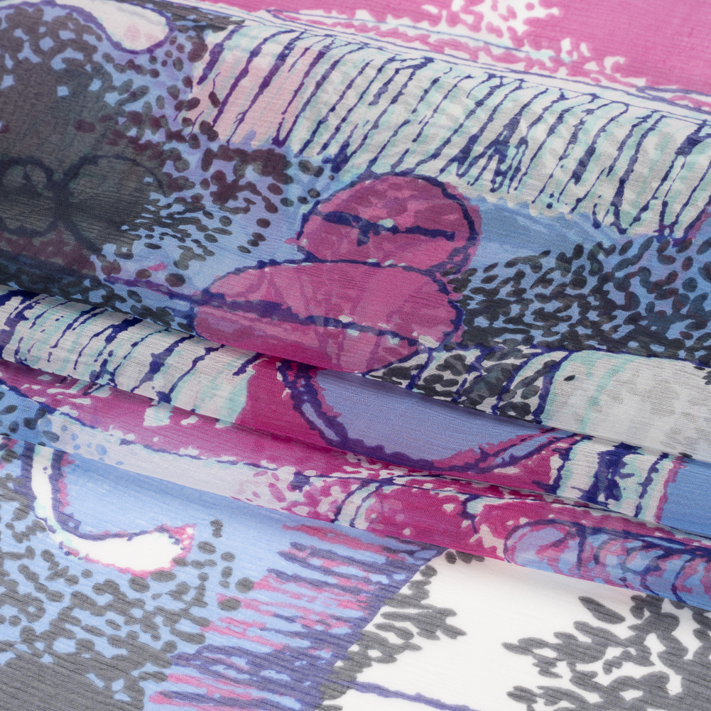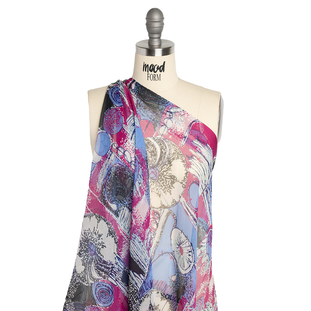 Life's so fun with this Periwinkle, Magenta and Black Flowers and Blocks Crinkled Silk Chiffon! Against a blue and purple background, flowers sprout around black doodles.Romanticize any silhouette with silk chiffon’s sheer quality and airy drape. A soft yet slightly crinkled hand accompanies this ethereal fabric, inspiring floor-length gowns, dusters, blouses with ruffled sleeves, scarves, and more. A tip from our sewists: do not feel intimidated by sewing this delicate fabric; using a rotary cutter (or sharp scissors and sharp pins), fine needles, tight stitching, French seams, and patience, anyone can show up to a special occasion wearing a silk chiffon garment they created themselves!