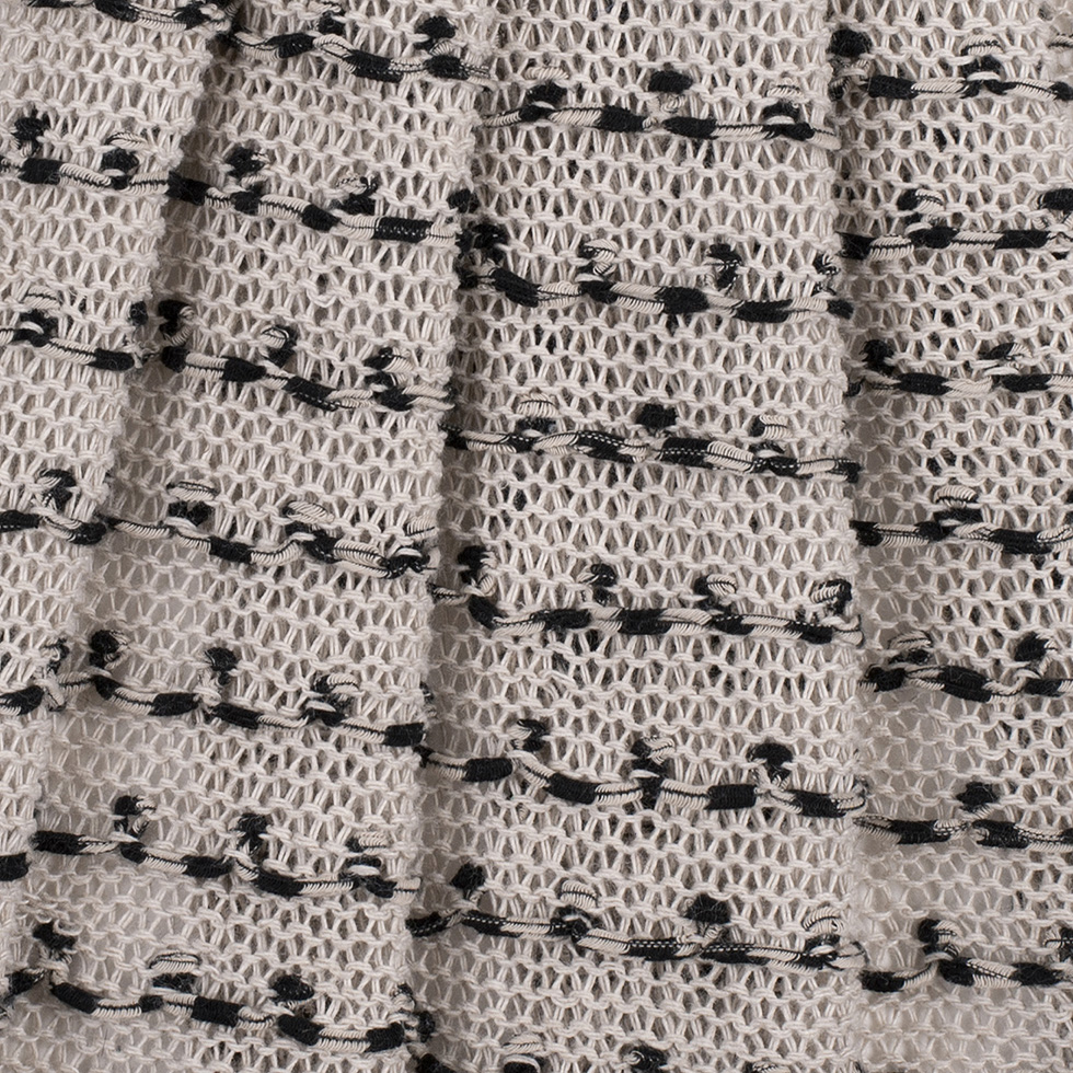 Loosely knit, here is a cotton and wool blended material perfect for the creation of sweaters, ponchos and cardigans. Decorated with evenly spaced black dots, this peyote sweater knit is both visually compelling and stylistically simplistic. Both breathable and meant to insulate to a certain degree, this material would be great for 3 seasonal wear. Note: This knit is see-through.