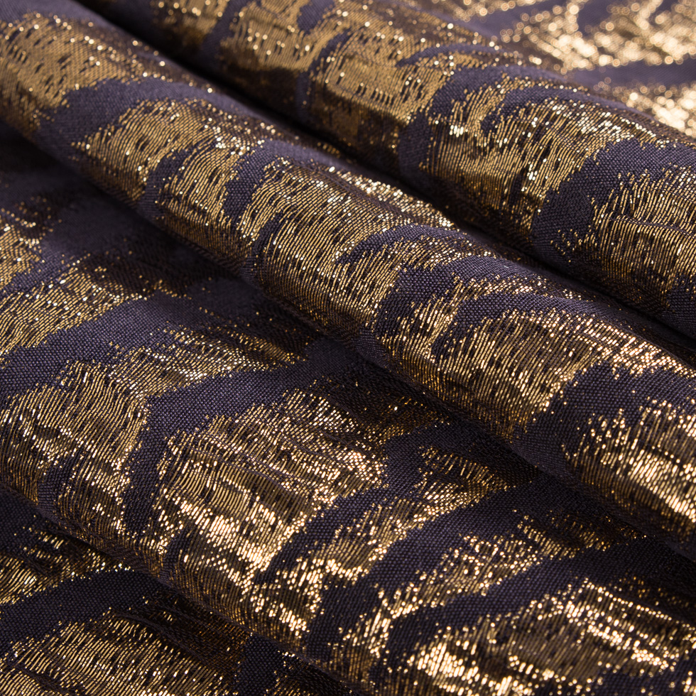 From the fabulous designer Phillip Lim comes a gorgeous grape & metallic gold abstract silk brocade ready to be used for exquisite designs. Containing a beautiful abstract waving line design glimmering throughout, this fabric brings an air of elegance to any sophisticated design. It's lightweight, soft and slightly textured with an easy, flexible drape. Laying at 45" in width and nearly opaque, create stunning tops, lavish shirts, dazzling dress and beautiful skirts all leaving a high-end impression from this designer silk.
