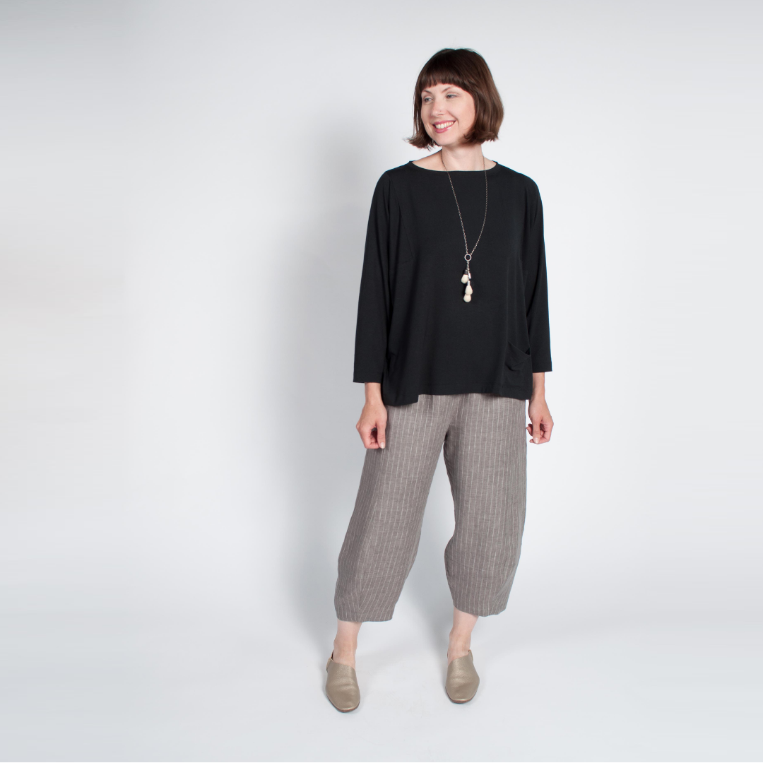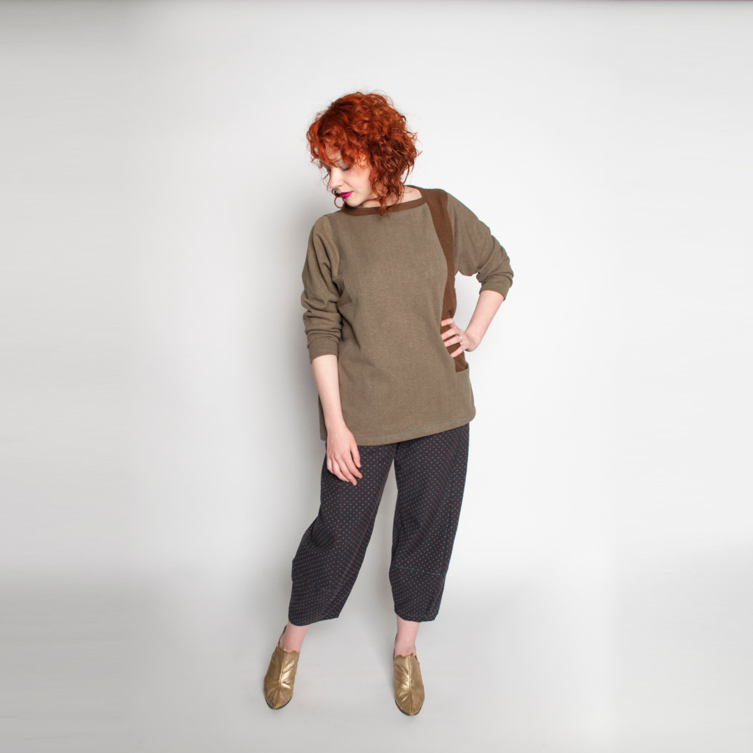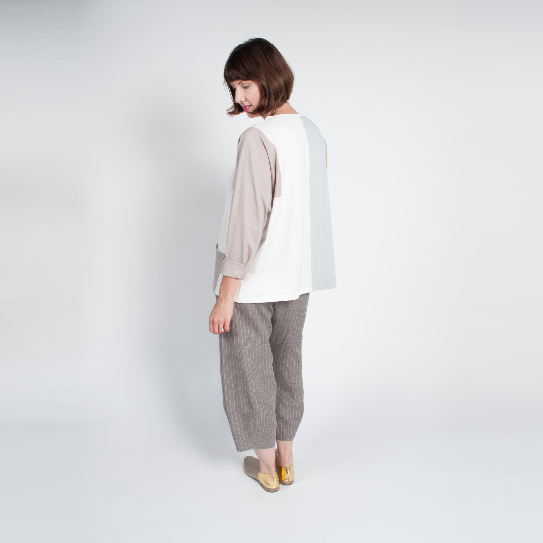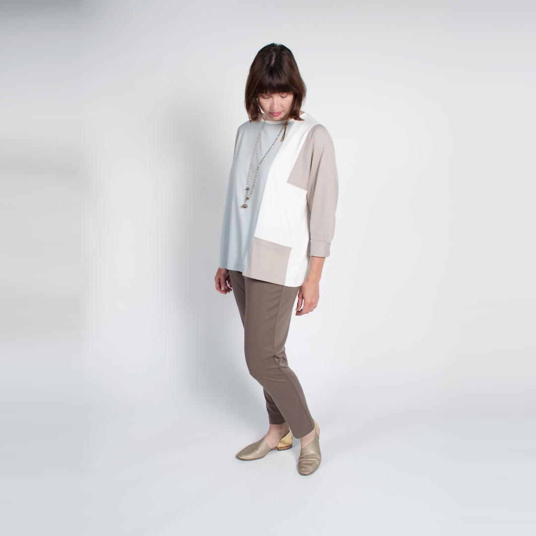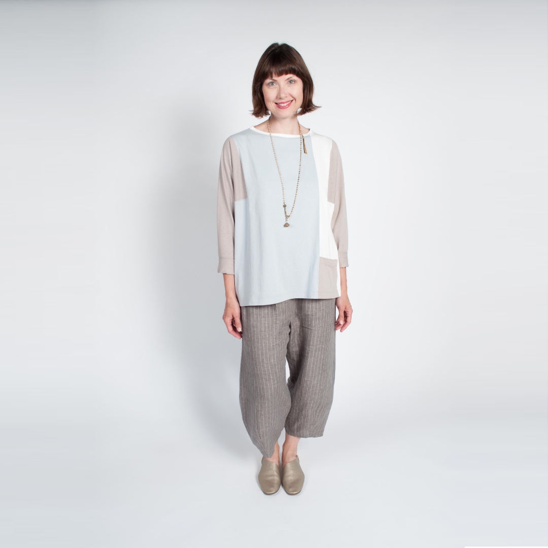 Picasso Top Loose-fitting top with jewel neckline, off-center front seam, square-inset long tapered sleeves, and front pocket. Special overlapping seam technique included in instructions.