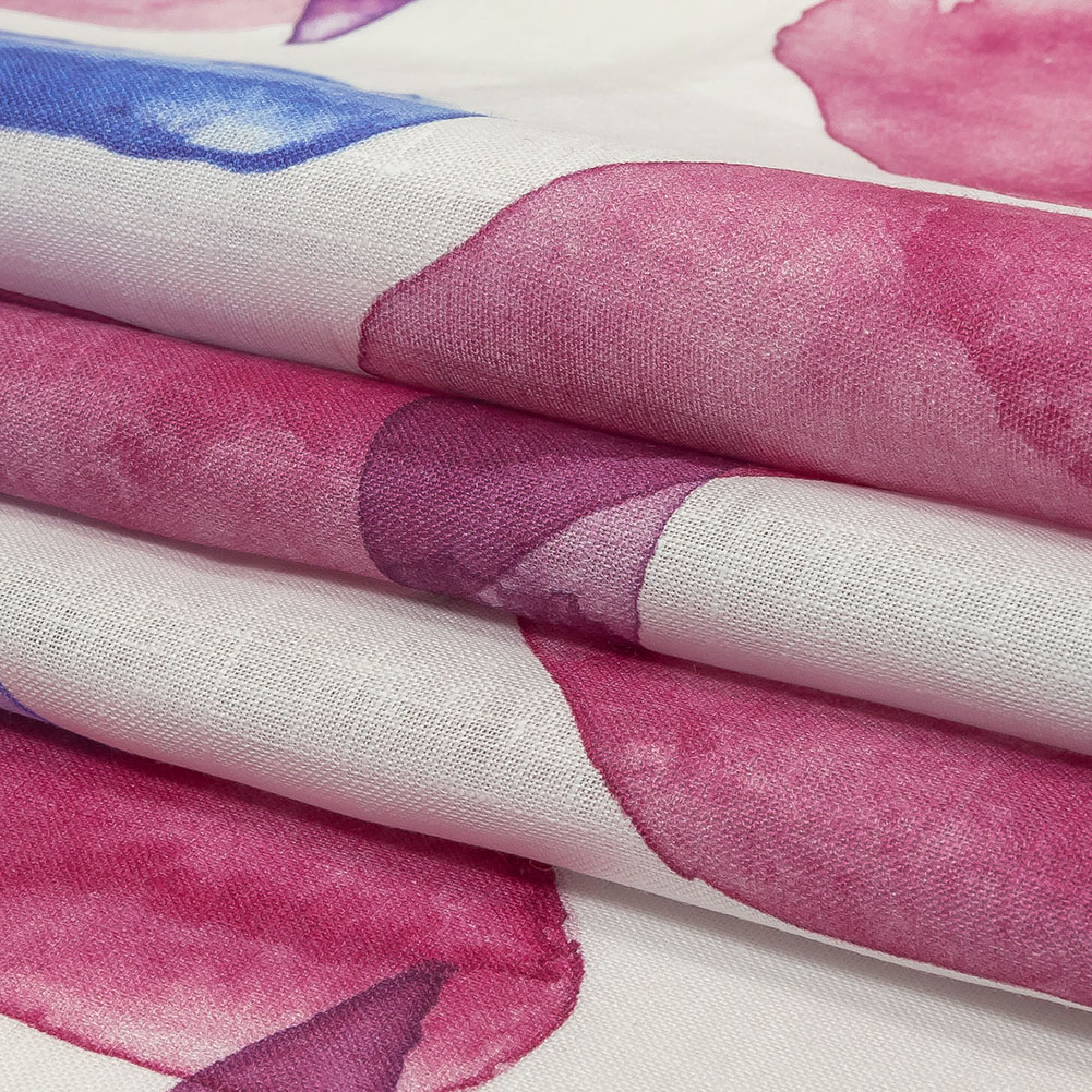 Watercolor takes on an edge with this Pink, Blue, and Green Painterly Geometry Medium Weight Linen Woven! An assortment of loose watercolor diamonds in magenta, blue, green, and purple decorate a cool, slubbed white ground.