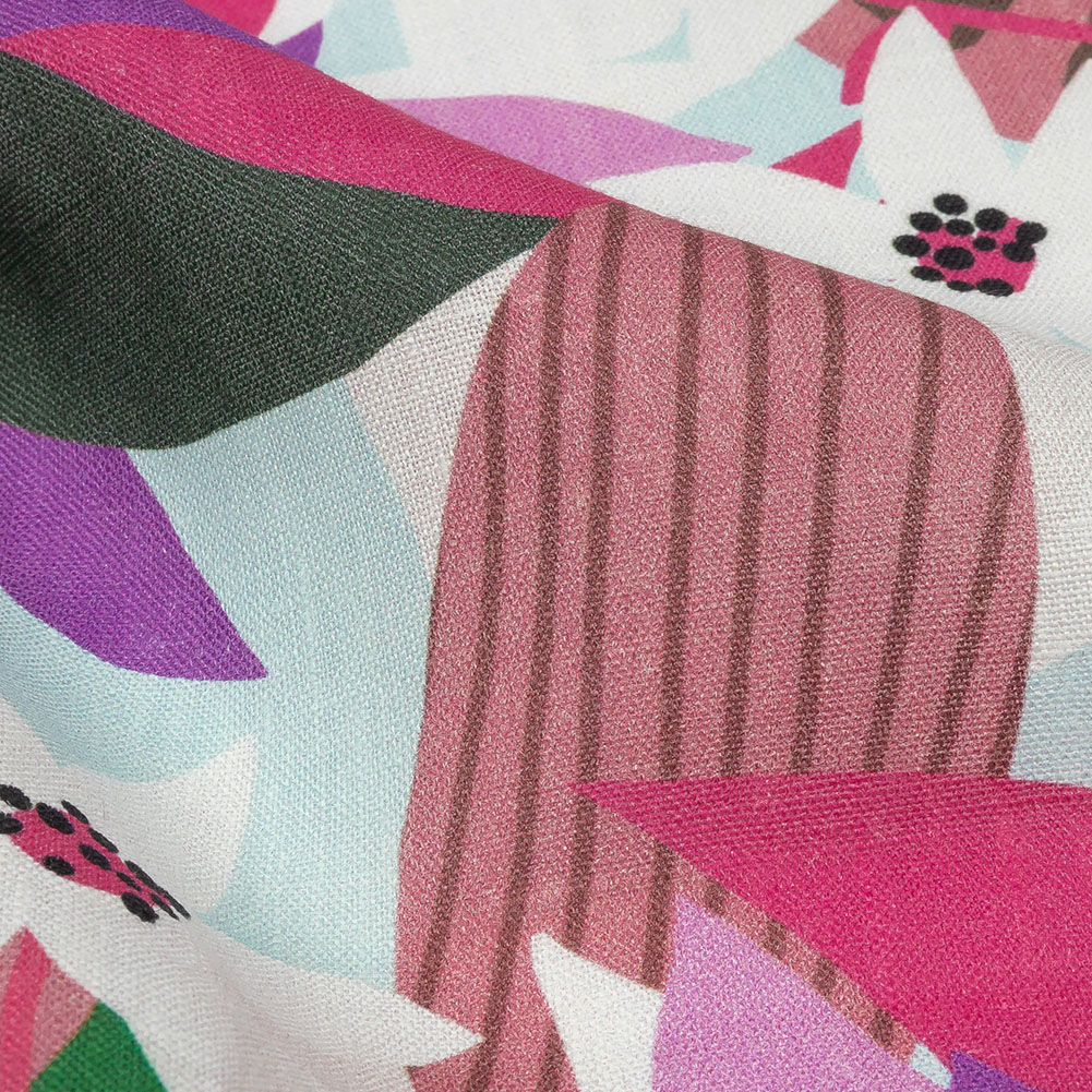 The tropics are not too far away when you have this Pink, Green, and Aqua Animated Tropics Medium Weight Linen Woven. Brightly colored foliage spreads over a sky-blue ground. With a soft, slightly crisp texture and flexible drape, design dresses, aprons, bags, button-down shirts, skirts, pillowcases, tablecloths, shorts, runners, crop tops, bandeau tops and so much more. This material has no stretch and is opaque, so a lining is entirely optional.