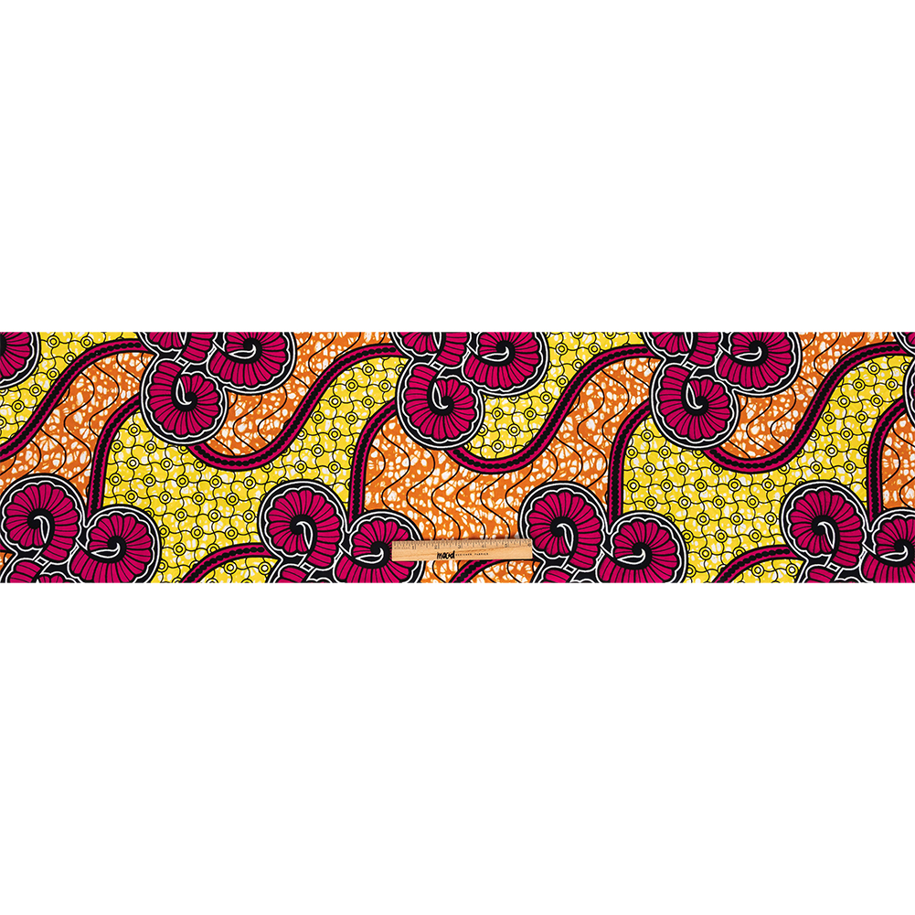 Like a splash of summer sun, this Pink, Lemon and Orange Spirals and Abstract Cotton Supreme Super Wax African Print will warm your heart! Patches of textured lemon yellow and orange are divided by hot pink spirals and topped with black detailing.
