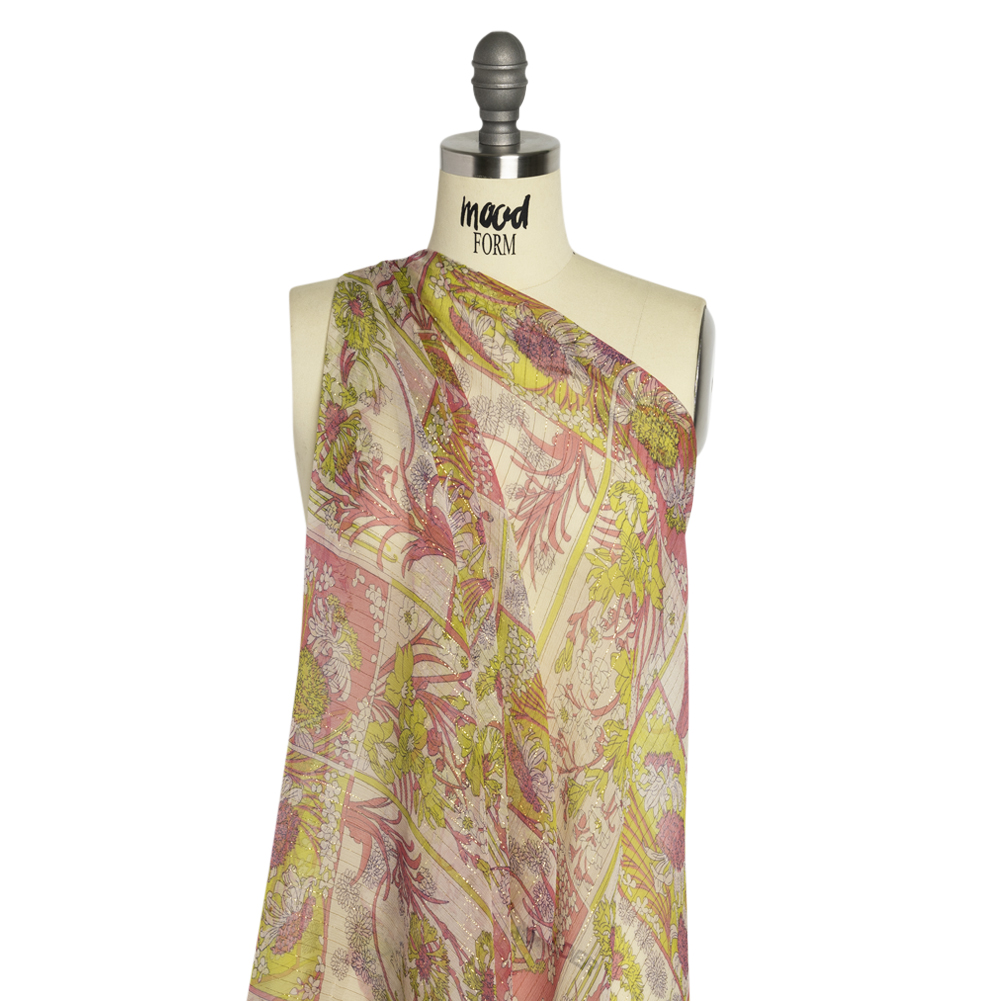 Pink, Lime and White Floral Patchwork Metallic Pinstriped Silk Chiffon