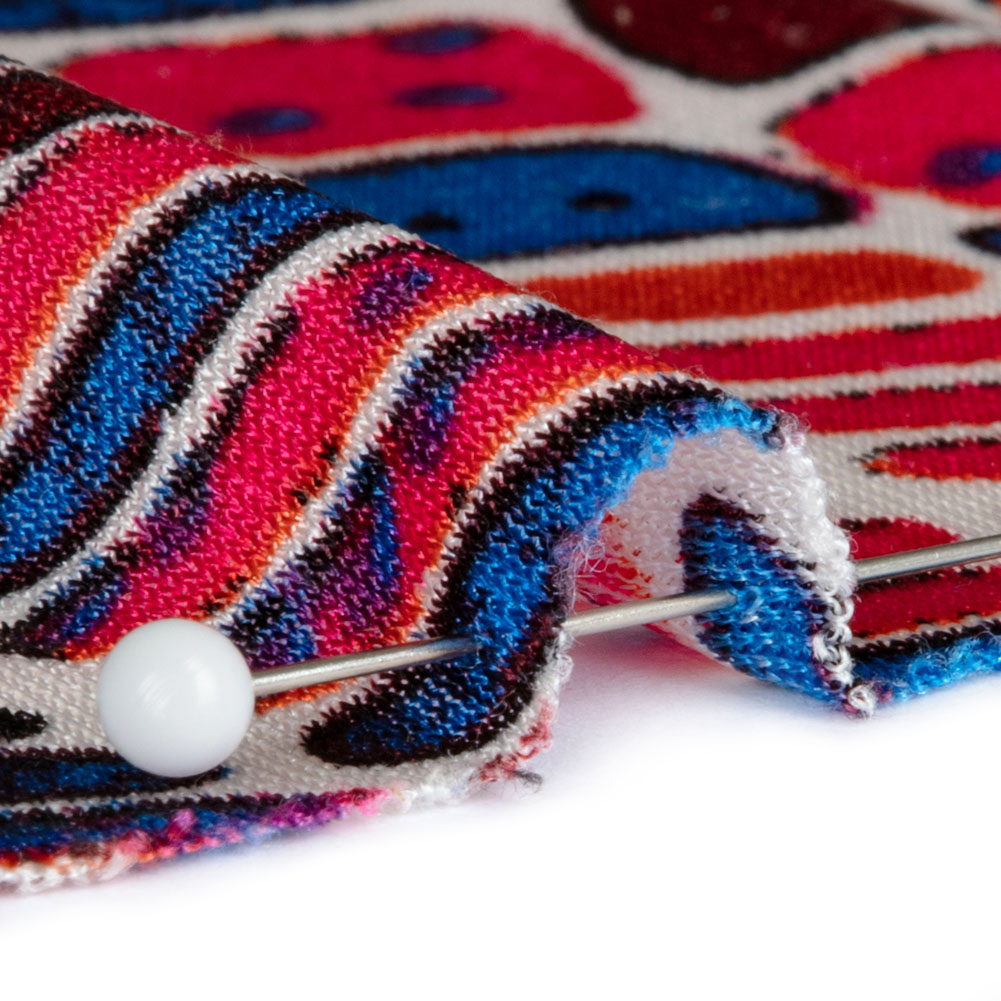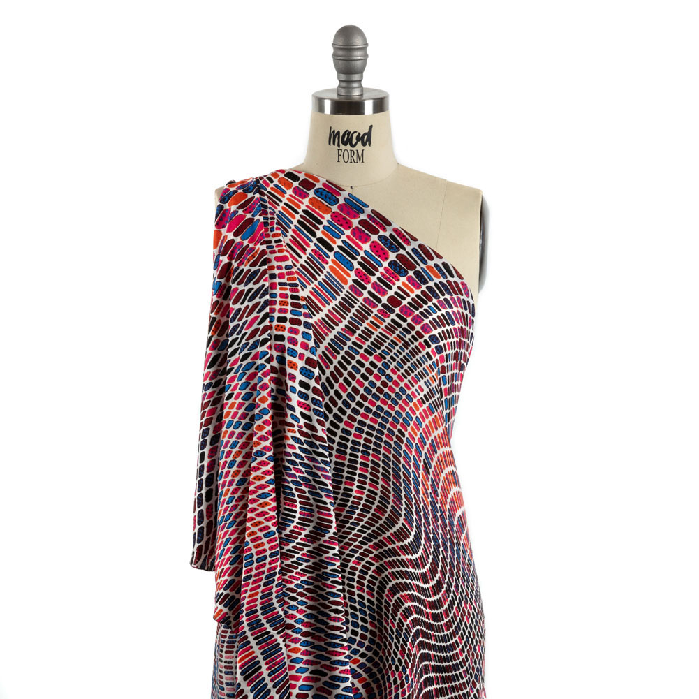 Ride the wave of this Pink, Orange and Blue Shapely Waves Silk Jersey! Orange, pink, purple, and maroon dominos speed through a vortex, bending and stretching in organized lanes like cars whizzing down an interstate. Thanks to the silk content, the hand is luxuriously sleek and the face displays a modest luster. Add that to the supple drape and comfortable 50% weft-wise stretch and you’ve got yourself a go-to fabric! Taking into account its translucent quality, dare to create exciting bodycon dresses, bold summer tops, form-fitting long-sleeve shirts, and more!