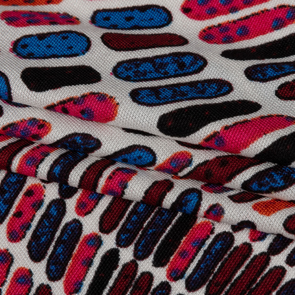 Ride the wave of this Pink, Orange and Blue Shapely Waves Silk Jersey! Orange, pink, purple, and maroon dominos speed through a vortex, bending and stretching in organized lanes like cars whizzing down an interstate.