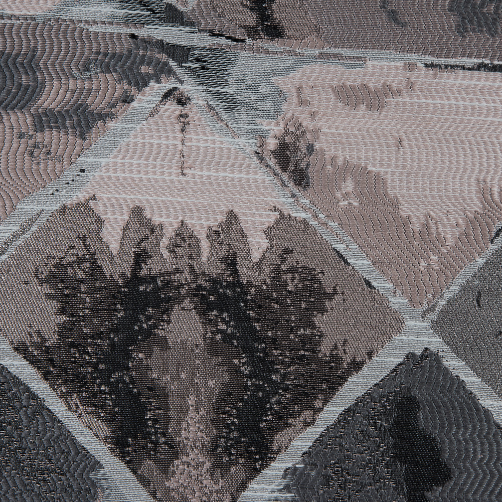 Create a contemporary masterpiece with this Pink, Silver and Black Abstract Diamond Brocade. Diamond shapes are given a distressed, almost watercolor-like appearance. Luminous pale pink, gray and black are met with a shimmering silver taking the pattern even further towards contemporary heights. From cocktail dresses to light coats, it has a voluminous drape that lends itself to tailored garments. Thin and of a medium weight, it is opaque allowing a lining to be optional.