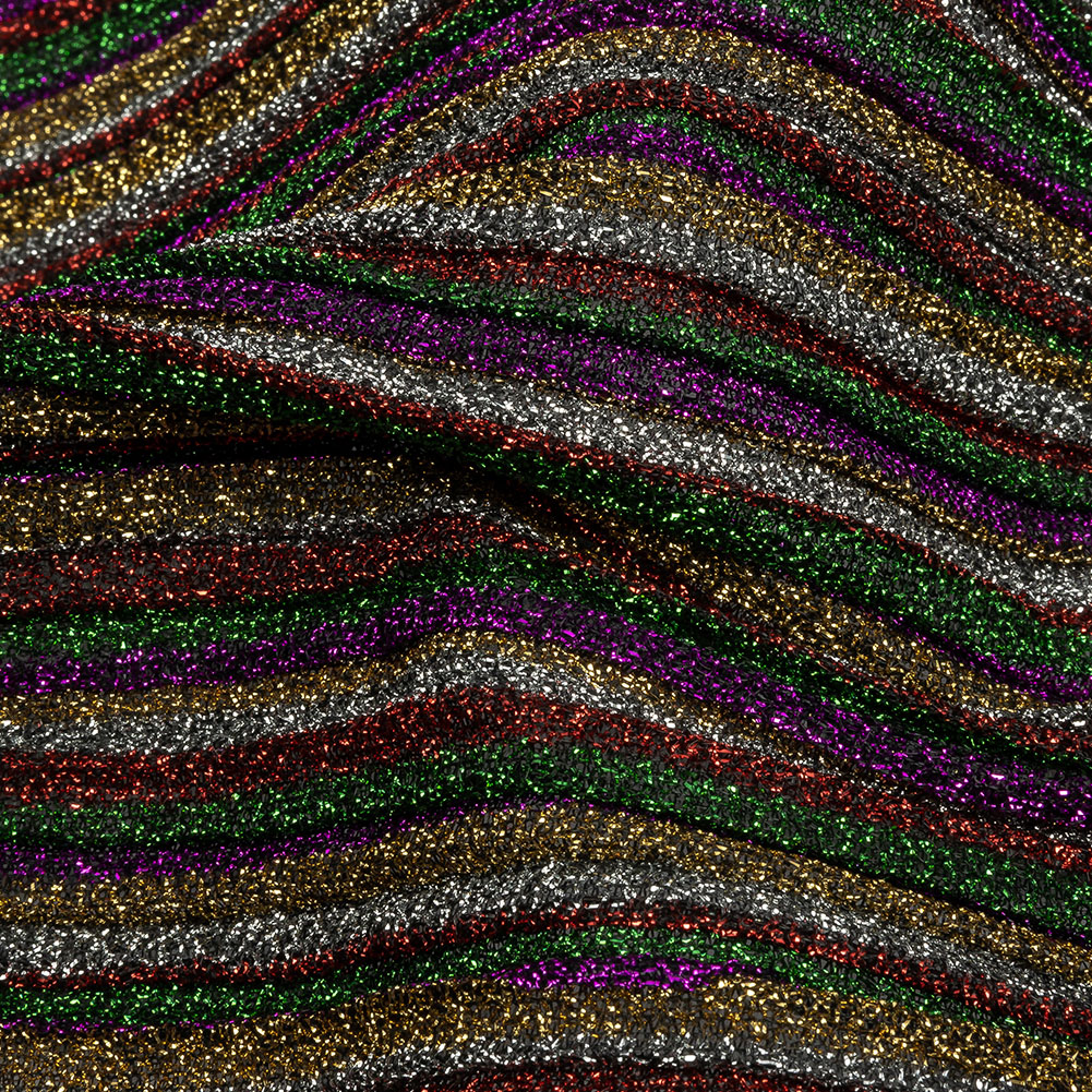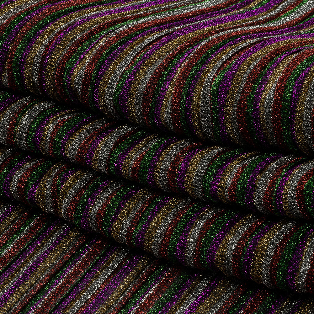 Pleated Polyester Knit – Purple, Green and Red Metallic Stripes
