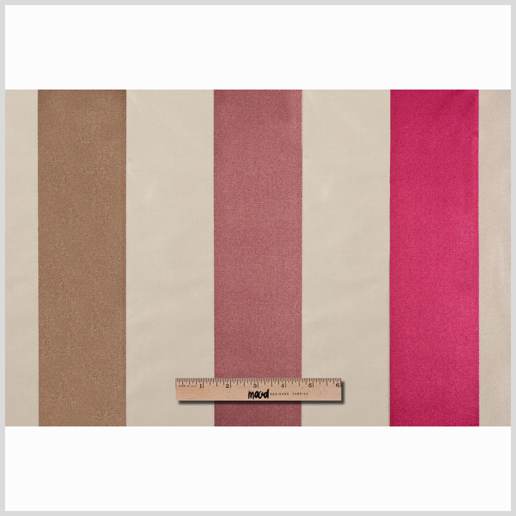 Poly satin from England. Three-inch wide stripes of champagne, mocha, mauve and plum.