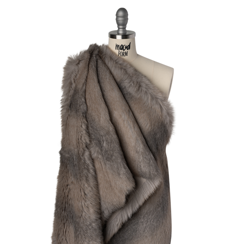 You don’t need a fire when you’ve got this Soft Striped Plush Three-Tone Long Pile Recycled Polyester Faux Fur to keep you warm. With a soft, fuzzy hand and flexible drape, this fabric slips effortlessly into luxury—ready to cocoon you in comfort with every wear.Suggested Projects: Coats, Shrugs, Capes, HatsContent: 100% Recycled Polyester, 100% Polyester BackingStretch: NoneOpacity: OpaquePlush and voluminous, this gray faux fur is tipped with tan and charcoal, forming bold, alternating stripes that give the fabric striking depth and unmatched allure. This faux fur calls to be touched, its soft, fuzzy hand and flexible drape wrapping you in pure luxury and comfort. Without stretch, it transforms effortlessly into sweeping coats, elegant shrugs, flowing capes, or even chic accents for hats, bags, and throws—bringing sophistication to every corner of your life. Opaque on its own, it doesn’t require a lining, though one may be added for an extra layer of comfort.Note: This fur’s pile measures approximately 1¾” an inch in length.