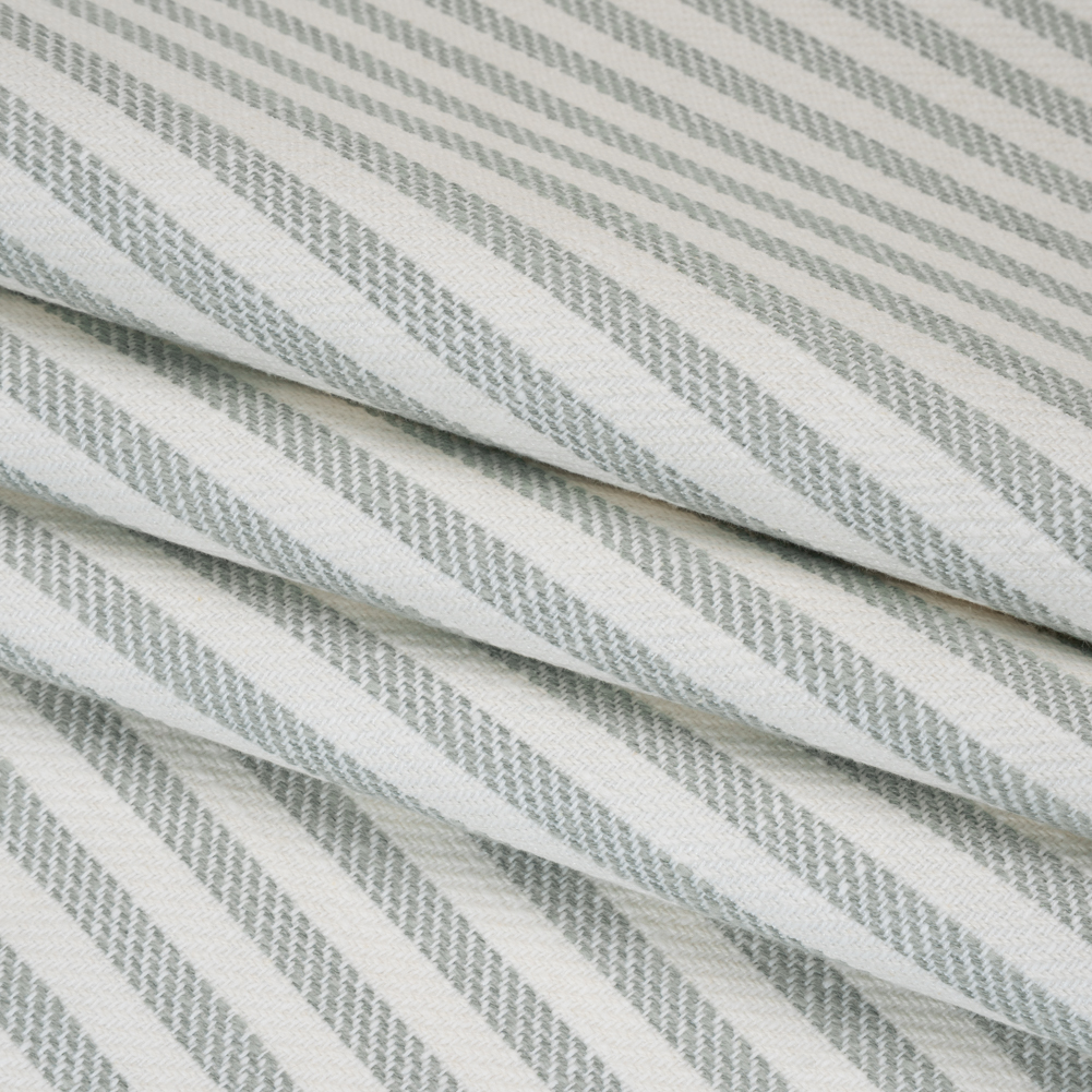 Introduce some coastal charm and soothing, seaside rhythm into your designs with this Seafoam Striped Polyester and Cotton Herringbone Twill. With a soft, tactile hand and supple drape, it infuses your space with effortless, laid-back charm and inviting texture.Suggested Projects: Curtains, Drapes, Headboards, Throw PillowsContent: 67% Polyester, 33% CottonStretch: NoneOpacity: Mostly OpaquePale blue-green and off-white threads intertwine in alternating stripes, with a herringbone weave adding a relaxed, rustic charm to the fabric. Its soft, tactile hand—brought to life by the twill weave—pairs effortlessly with a supple drape, making it perfect for floor-length curtains, flowing drapes, statement headboards, and cozy throw pillows. Mostly opaque on its own, a lining can be added to soften window treatments and provide extra protection from the sun.