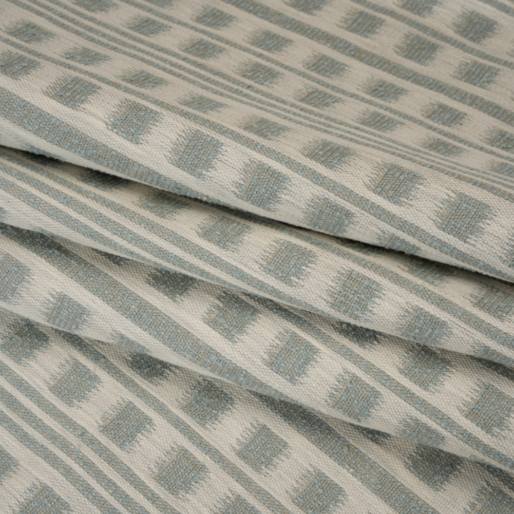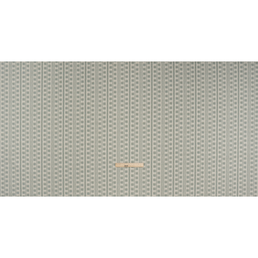 Soothing seaside vibes lap up at your shores atop this Seafoam Ikat Squares in Stripes Polyester and Cotton Home Decor Jacquard—featuring a soft, tactile hand and voluminous drape.Suggested Projects: Armchairs, Drapes, Headboards, CushionsContent: 68% Polyester, 32% CottonStretch: NoneOpacity: OpaqueIn pale blue-green and off-white, stripes of varying thickness are punctuated by blocky ikat squares—creating a fabric full of dimension, rhythm, and refined allure. Rich in texture and artistry, this jacquard boasts a soft, tactile hand and voluminous drape that falls with sculptural grace. Perfect for upholstered armchairs, statement headboards, matching cushions, and even flowing curtains and drapes, it brings elegance and depth to every corner. Opaque, though a lining may be added for a softer, more refined finish when used as drapery.