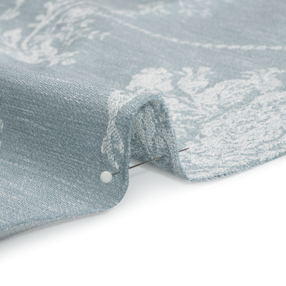 Imagine the fresh look of this British Imported Pale Seaspray Scrolls and Leaves Polyester and Cotton Jacquard dancing with the breeze from an open window. Bouquets and floral chandeliers grace this sky-blue fabric with a lighter hue, creating a contrast in both color and feel. The dimensional face is textured by vertical slubs and embroidered-like floral motifs, woven on a Jacquard loom with soft cotton and polyester fibers. With its malleable drape, understated drapes and valances are just a stitch away!