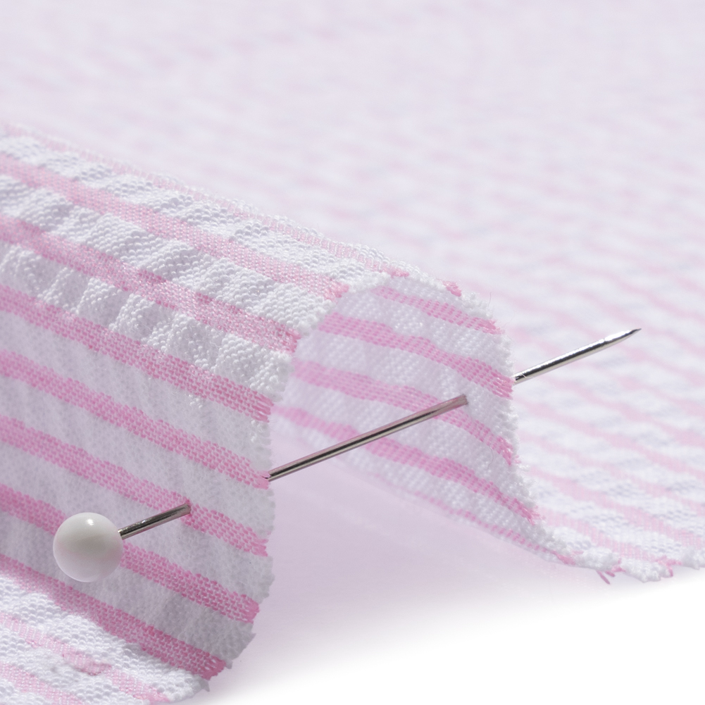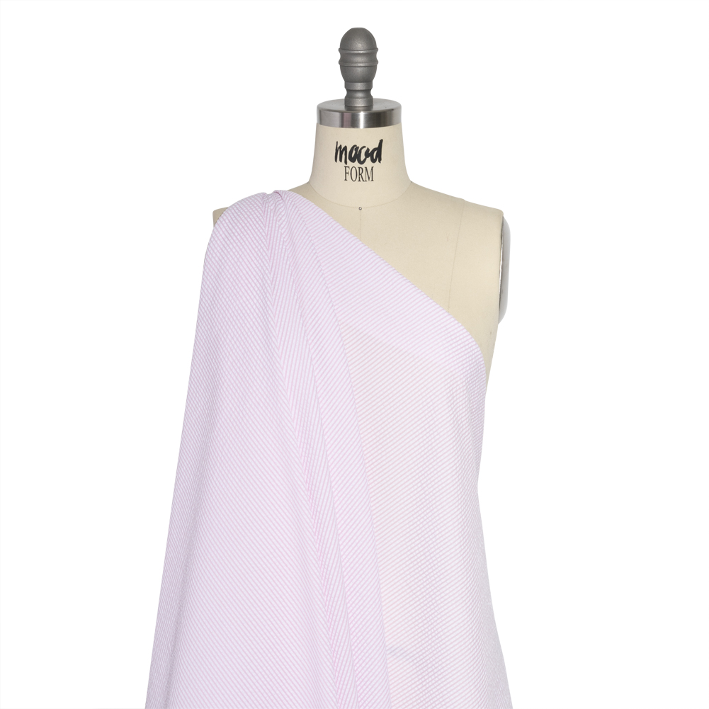 Cool off with a sweet treat! Grab this Wylie Pink and White Candy Striped Polyester and Cotton Seersucker (and an ice pop, while you're at it!). The lightweight nature of seersuckers make them a functional fabric for warm weather climates; the puckered face feels cool on your skin as the easy drape catches the breeze. Often seen in stripes or checkers, this specific seersucker is lined with pale pink and white candy cane stripes—a simple yet playful demonstration of color. Touching upon Americana, preppy, and nautical fashion trends, this versatile, gender-neutral fabric is perfect for both old and young, semi-formal and casual occasions, and everything in between. Don’t sacrifice your style for the sake of staying cool; create breathable button-ups, cute dresses, paper bag pants, comfortable blazers, and more! Slightly translucent, a lining may be desired for added opacity and structure.