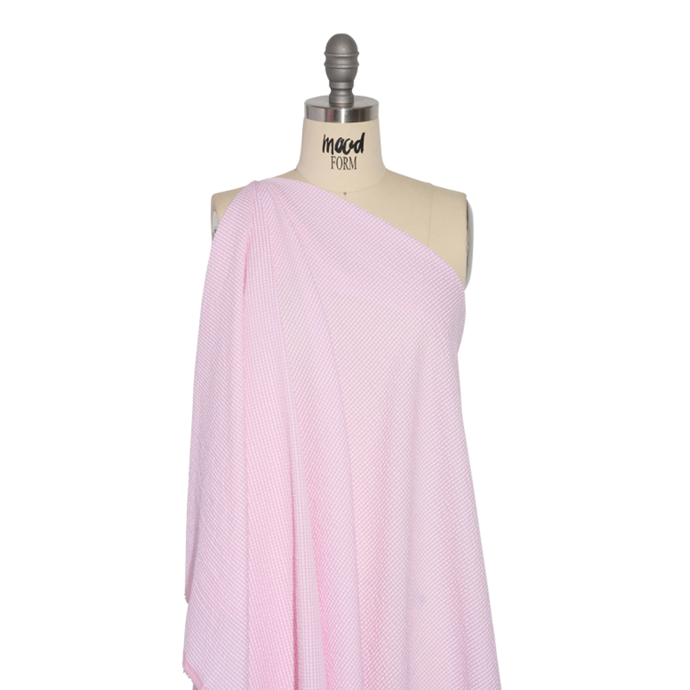 Evoking the same youthful energy as a picnic on a summer's day, this Wylie Pink and White Checkered Polyester and Cotton Seersucker is a cute addition to your warm-weather wardrobe. The crinkled face (created by weaving tight and loose threads) is what visually distinguishes seersuckers from other fabrics. Functionally, seersuckers stand apart from the rest as their lightweight construction and cool, crisp hand—thanks to the cotton content—aid in combating the heat. Touching upon Americana, preppy, and nautical fashion trends, this pink and white checkered fabric offers its playful look to a variety of sewing projects. Create breezy dresses, cute shorts, comfortable blazers, cool slacks, and more! Mostly opaque, a lining may be desired for added opacity and structure.