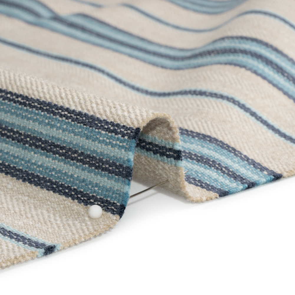 Let this British Imported Denim Herringbone Striped Polyester and Cotton Twill characterize your space. This selection of twills sparks interest in the details; the herringbone weave adds texture and visual intrigue to each fabric, diffusing a curated look throughout your space. The classic navy, light blue, and beige striped face is simple yet evocative, making for timeless drapes, curtains, valances, and even light upholstery projects.This fabric yields a malleable drape and a pebbly hand. While entirely opaque, the addition of a lining will soften your window treatments and add protection from the sun.