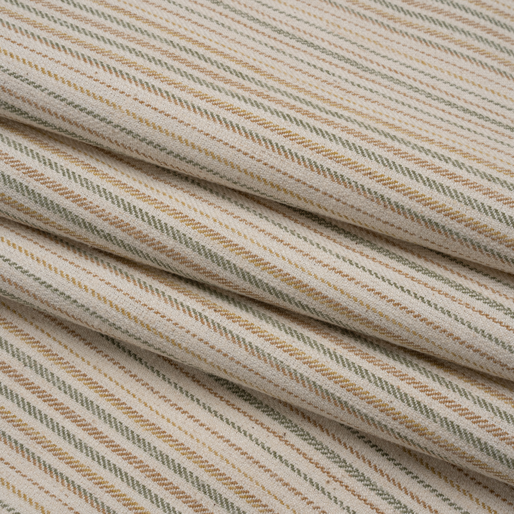 Relax the energy in your home with this British Imported Moss Barcode Stripes Polyester and Cotton Twill. Green, yellow, and tan stripes highlight the diagonal threading of the weave, a characteristic that visually distinguishes twills from other weaves. Found in kitchens, living rooms, sunrooms, and dens, this durable fabric withstands the wear and tear of a busy home as it decorates your spaces in a soft, pebbly texture. With the supple drape, you can easily reupholster sofas, armchairs, breakfast nook benches, and more!