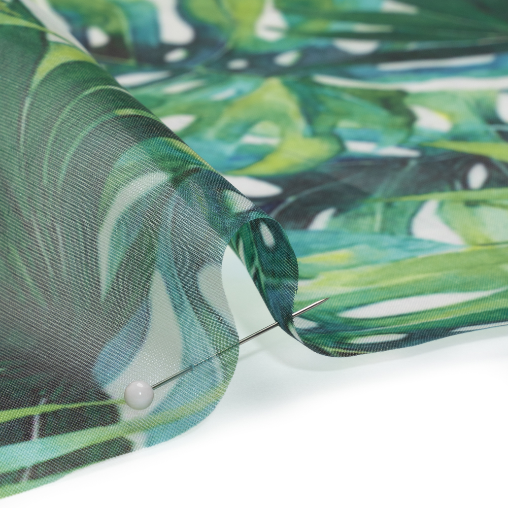 You can practically hear the calls of tropical birds, hiding behind this Tropical Leaves Polyester and Viscose Organza.