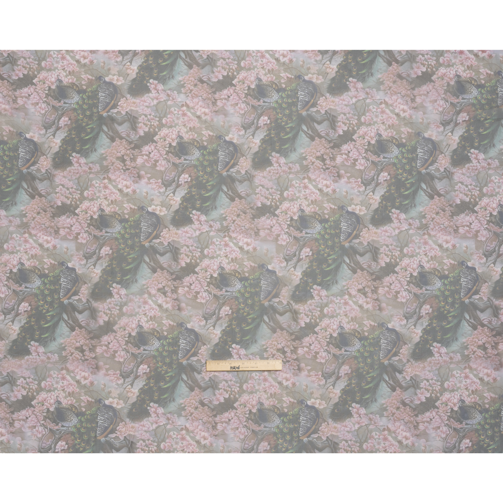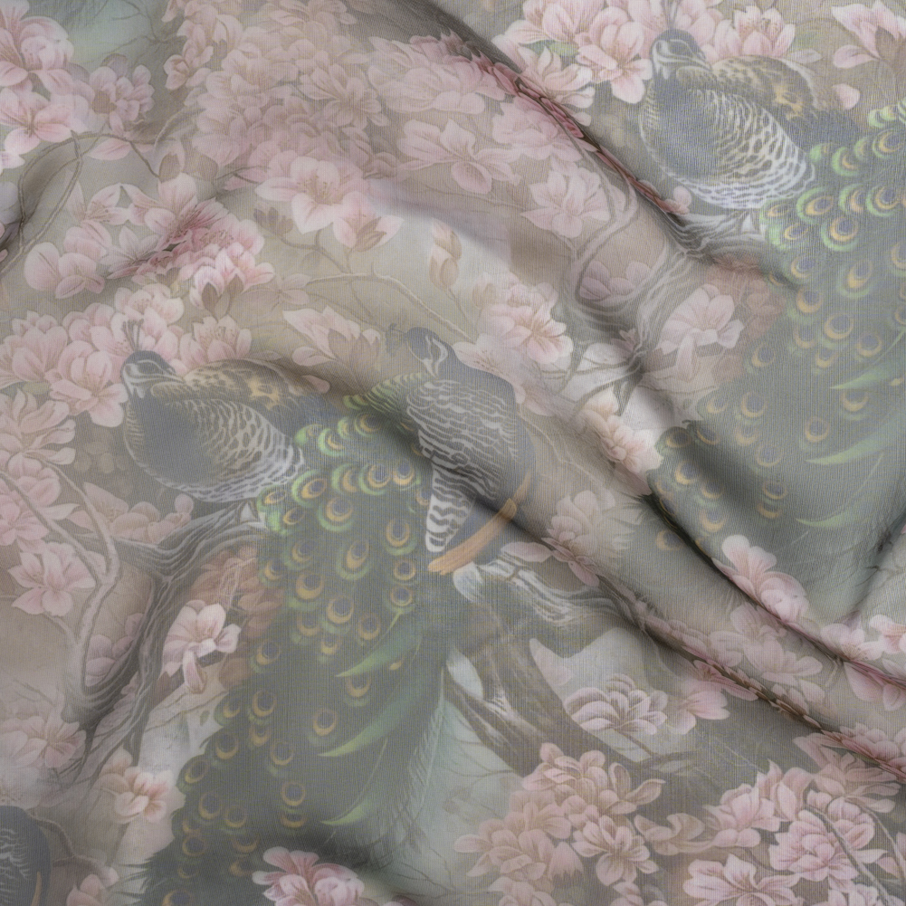 Polyester and Viscose Organza - Pink, Olive Green and Brown Peacocks and Blossoms