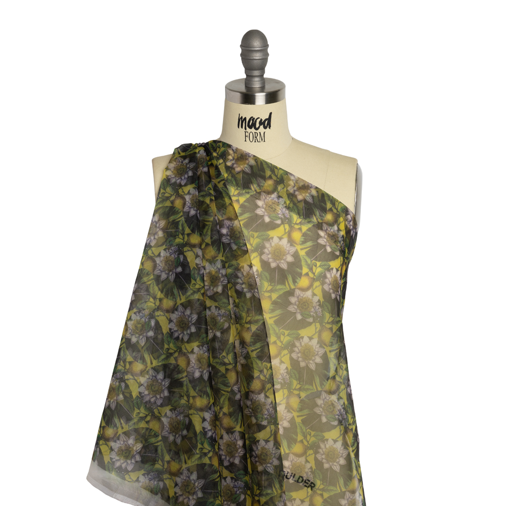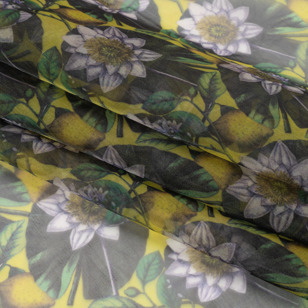 Sit back and sip limoncello in this Lemons and Lily Pads Polyester and Viscose Organza. With a grainy hand and airy drape, it’ll make you feel like you’re walking on air.Suggested Projects: Dresses, Gowns, Blouses, OverlaysContent: 70% Polyester, 30% ViscoseStretch: NoneOpacity: SheerThis bright yellow organza is sure to start conversations with its busy design of nearly-black lily-pads, white water lilies, rich yellow lemons, and bright green leaves. With a grainy hand and airy drape, use this organza to craft tiered dresses, blouses with puffed sleeves, breezy maxi-skirts, or use as a uniquely-patterned overlay for your designs. Sheer, we suggest use with a lining or layering.