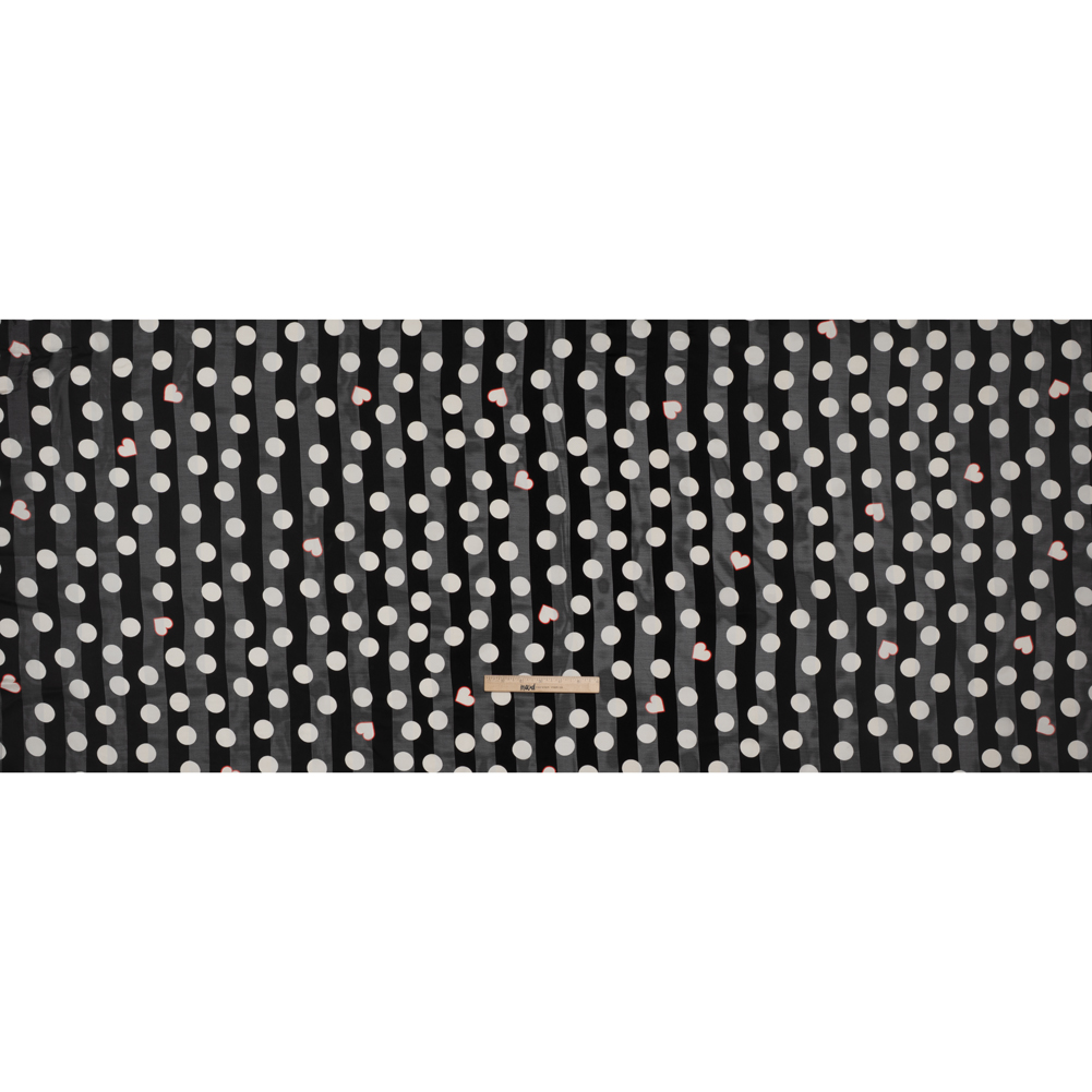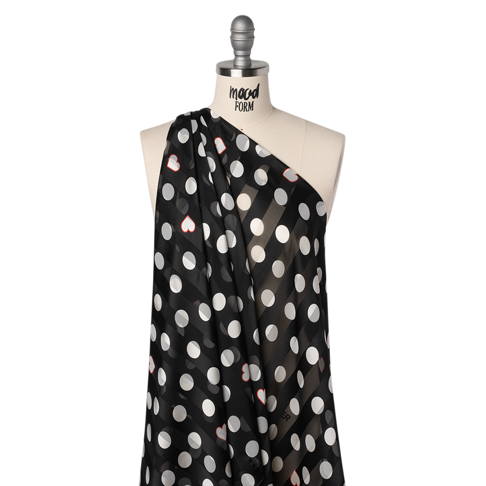 Polyester Awning Stripe Burnout Satin - Black, White and Red Polka Dots and Hearts - Designer Deadstock