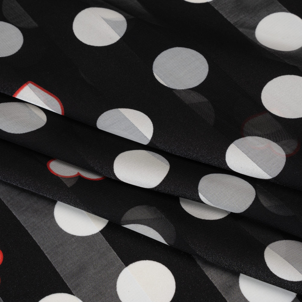 You’re sure to find a place in your heart for this Polka Dots and Hearts Polyester Awning Stripe Burnout Satin—featuring a smooth, slightly tactile hand and airy drape.Suggested Projects: Blouses, Skirts, Dresses, LiningsContent: 100% PolyesterStretch: NoneOpacity: SheerMatte and lustrous black awning stripes race across this burnout satin, white polka dots and white and red hearts bouncing across the face. The smooth surface catches the light with a soft luster while an airy drape gives the fabric a liquid-like, effortless movement. Its light weight and airy nature is perfect for creating flowing summer gowns and maxi skirts, breezy blouses, or luxurious linings for other projects. Sheer—thanks to the burnout sections—we suggest adding a lining for opacity and an elegant finish.