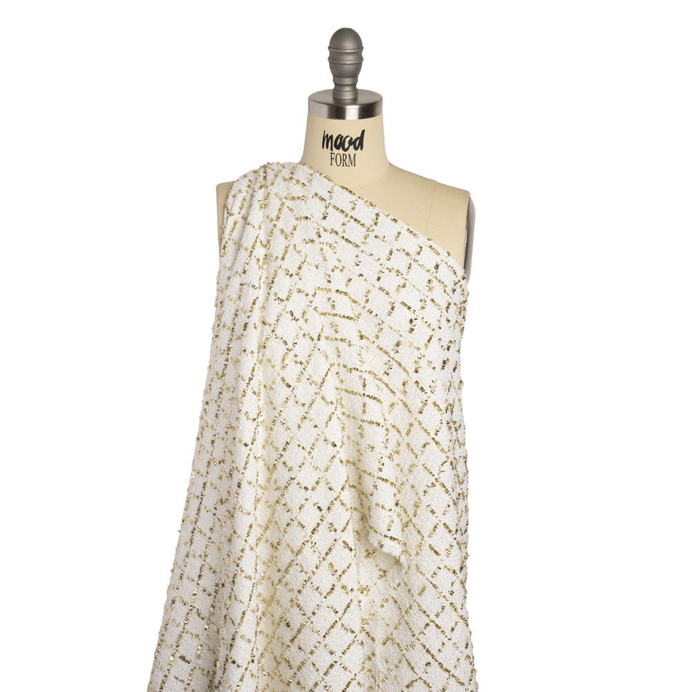 Tweed love to introduce you to this White Polyester Bouclé Tweed with Metallic Gold Plaid Eyelash Fringe, featuring a tactile hand and supple drape.Suggested Projects: Dresses, Skirts, Jackets, BlazersContent: Polyester, LurexStretch: NoneOpacity: TranslucentAll that glimmers is gold atop this bouclé tweed. Bouclé's looped texture elevates the artistry that comes naturally to a tweed fabric, drawing you into the white face with its dimensional allure. An added boost of luxury comes from the luster of the metallic gold eyelash fringe woven within the design. Featuring a lightweight feel and a supple drape, this fabric is ideal for pencil skirts with matching blazers, button-up mini dresses, jackets, and more. A lining will increase structure and warmth.
