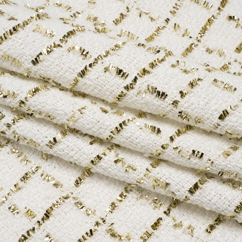 Tweed love to introduce you to this White Polyester Bouclé Tweed with Metallic Gold Plaid Eyelash Fringe, featuring a tactile hand and supple drape.