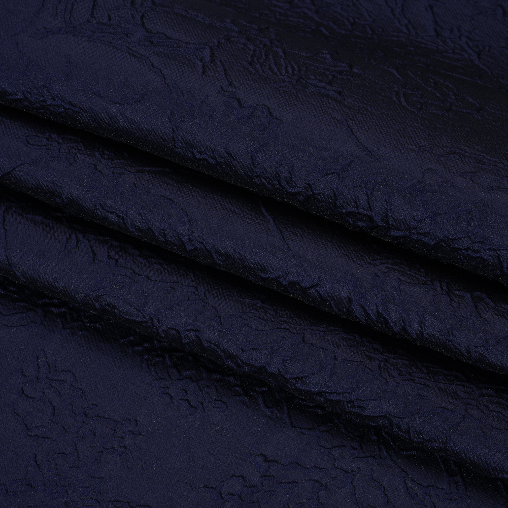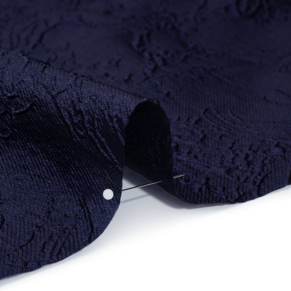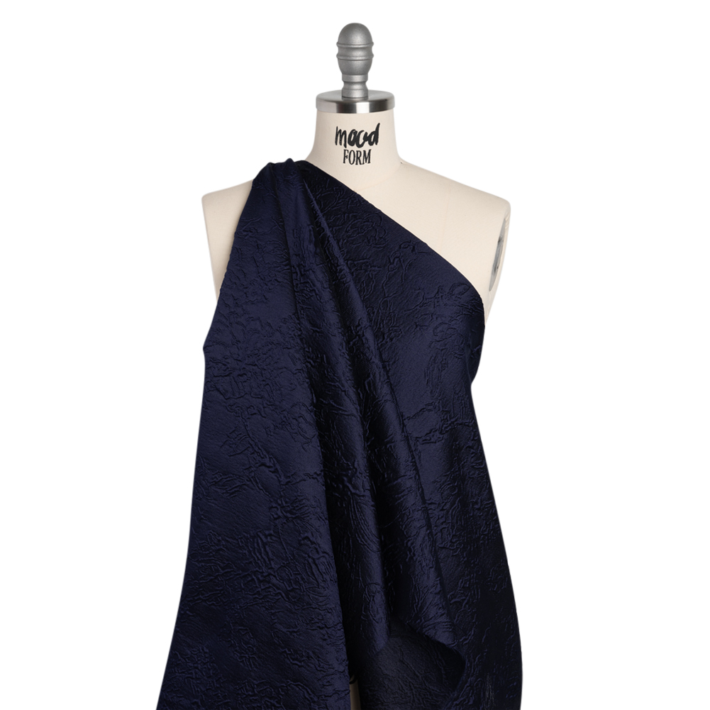 No need to run home at the stroke of midnight when you’re wearing this Monochrome Midnight Navy Floral Drawings Polyester Brocade—featuring a sleek, tactile hand and airy drape.Suggested Projects: Corsets, Gowns, Skirts, JacketsContent: 100% PolyesterStretch: NoneOpacity: TranslucentFloral drawings give an embossed look on the midnight navy surface, their puffed appearance lending rich visual and tactile dimension. The feel of the face is both sleek and pebbly, and the drape is airy and slightly structured. Invite this monochrome fabric to special occasions and glitzy nights out as a long gown, circle skirt, structured jacket, exciting corset, and more! As this fabric is translucent, a lining is recommended to increase opacity and luxury!