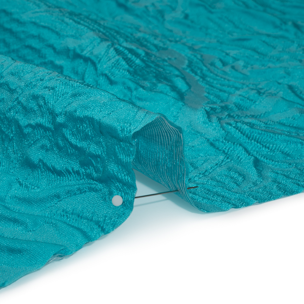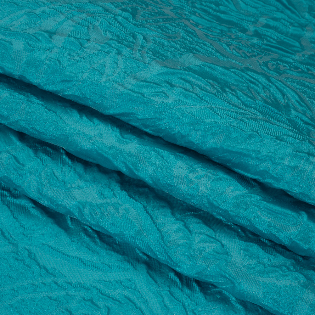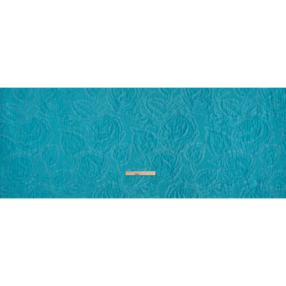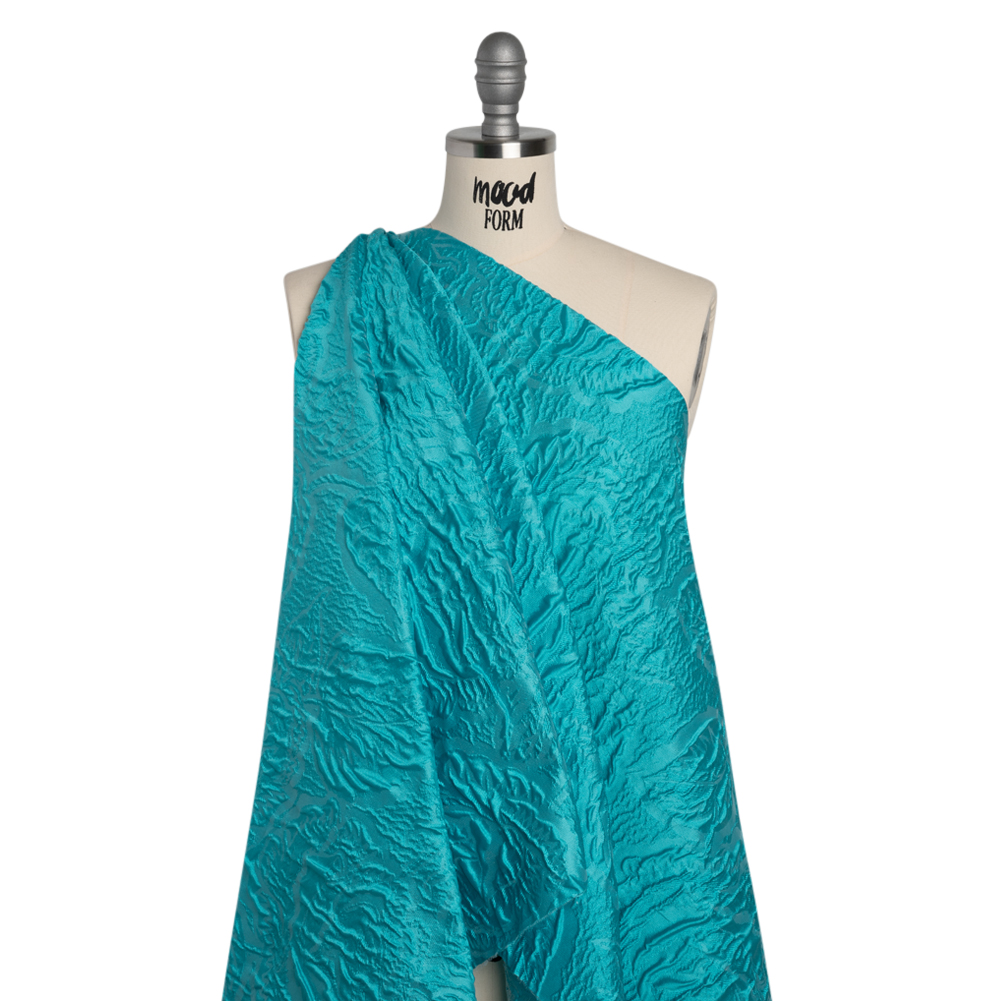 Enjoy a warm breeze blowing off the Mediterranean in this Monochrome Turquoise Roses and Leaves Polyester Brocade—featuring a tactile hand and semi-structured drape.Suggested Projects: Corsets, Gowns, Skirts, JacketsContent: 100% PolyesterStretch: NoneOpacity: Slightly TranslucentAn abstract design of roses and leaves rises in an embossed look on the turquoise surface, their puffed appearance lending rich visual and tactile dimension. The feel of the face is both sleek and pebbly, and the drape is slightly structured. Invite this monochrome fabric to special occasions and glitzy nights out as a long gown, circle skirt, structured jacket, exciting corset, and more! As this fabric is slightly translucent, a lining is recommended to increase opacity and luxury!