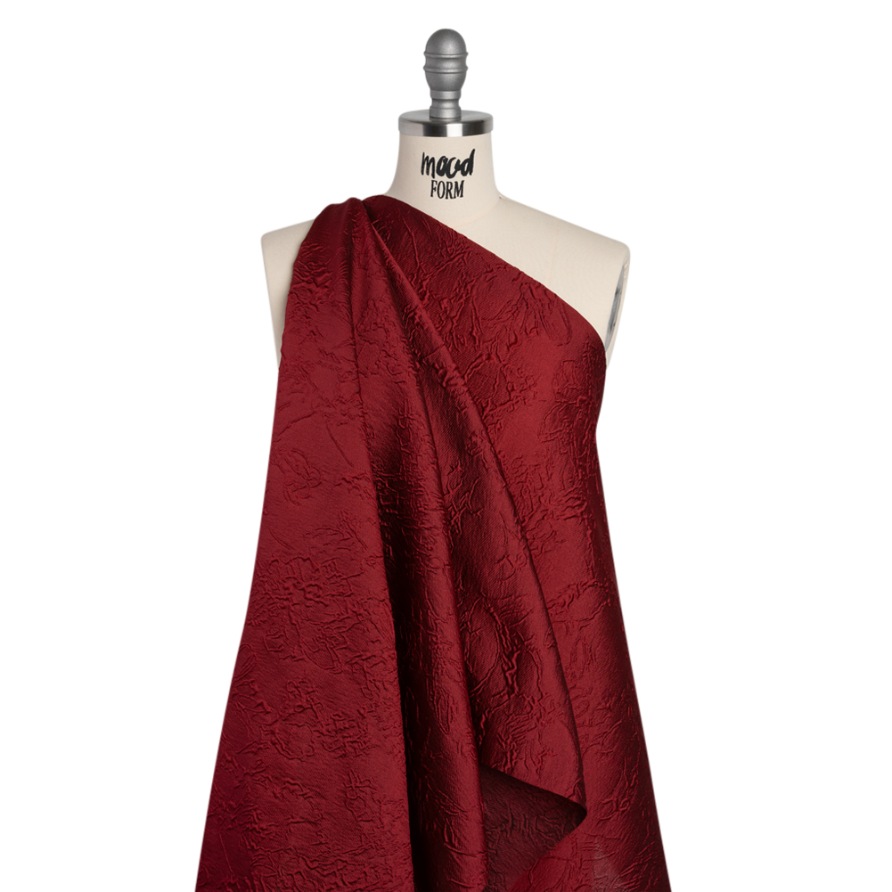This Monochrome Wine Red Floral Drawings Polyester Brocade looks even better in mer-low lighting—featuring a sleek, tactile hand and airy drape.Suggested Projects: Corsets, Gowns, Skirts, JacketsContent: 100% PolyesterStretch: NoneOpacity: TranslucentFloral drawings give an embossed look on the wine red surface, their puffed appearance lending rich visual and tactile dimension. The feel of the face is both sleek and pebbly, and the drape is airy and slightly structured. Invite this monochrome fabric to special occasions and glitzy nights out as a long gown, circle skirt, structured jacket, exciting corset, and more! As this fabric is translucent, a lining is recommended to increase opacity and luxury!