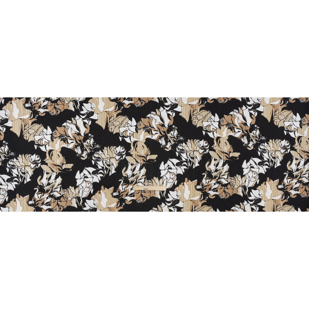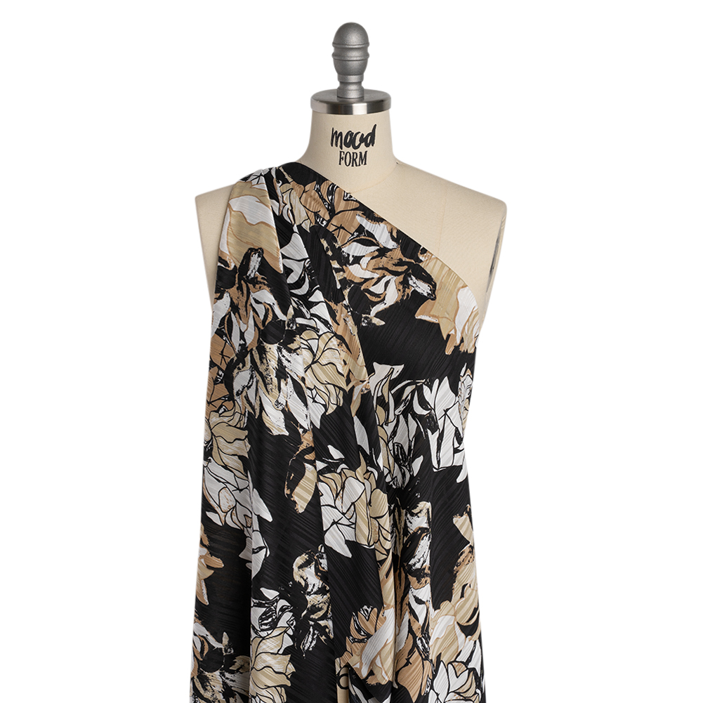 Give in to the blooming allure of this Floral over Burnout Stripes Polyester Crepe-Back Satin—featuring a sleek yet tactile hand and billowing drape.Suggested Projects: Shirts, Pants, Dresses, SkirtsContent: 100% PolyesterStretch: NoneOpacity: TranslucentFlowers bloom and climb across a black backdrop in hues of beige, white, and black—their forms made all the more alluring with a striped burnout finish to the fabric. In stark contrast with the matte, grainy reverse, the face boasts a sleek yet tactile hand—thanks to the burnout striped finish—and slight luster. To emphasize the full-bodied drape, create billowing summer gowns and maxi skirts with the satin side, or achieve a more casual style with patterned camp shirts and wide-legged pants. Translucent, we recommend adding a lining for opacity and a luxurious finish.