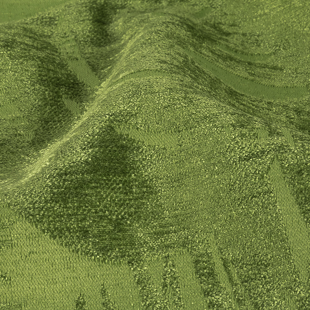For luxury beyond be-leaf, it has to be this British Imported Leafy Kiwi Polyester Chenille! Featuring vivid grass-green fuzzy chenille leaves rising over a smoother ground of the same color, all with a brilliant sheen, this woven offers a heavy, malleable drape and no stretch.