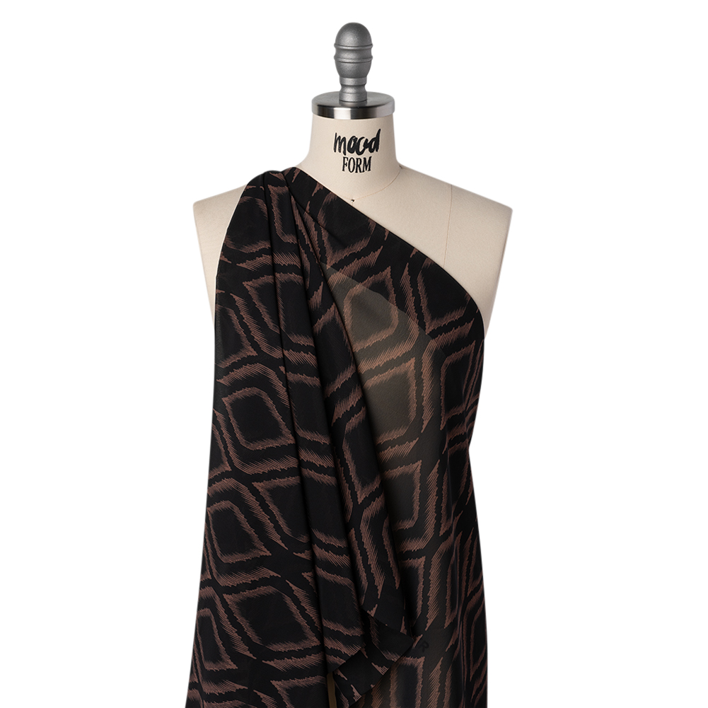 Polyester Chiffon - Black and Tan Ikat Ogees - Designer Deadstock