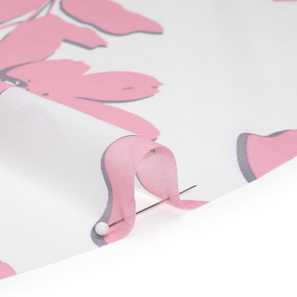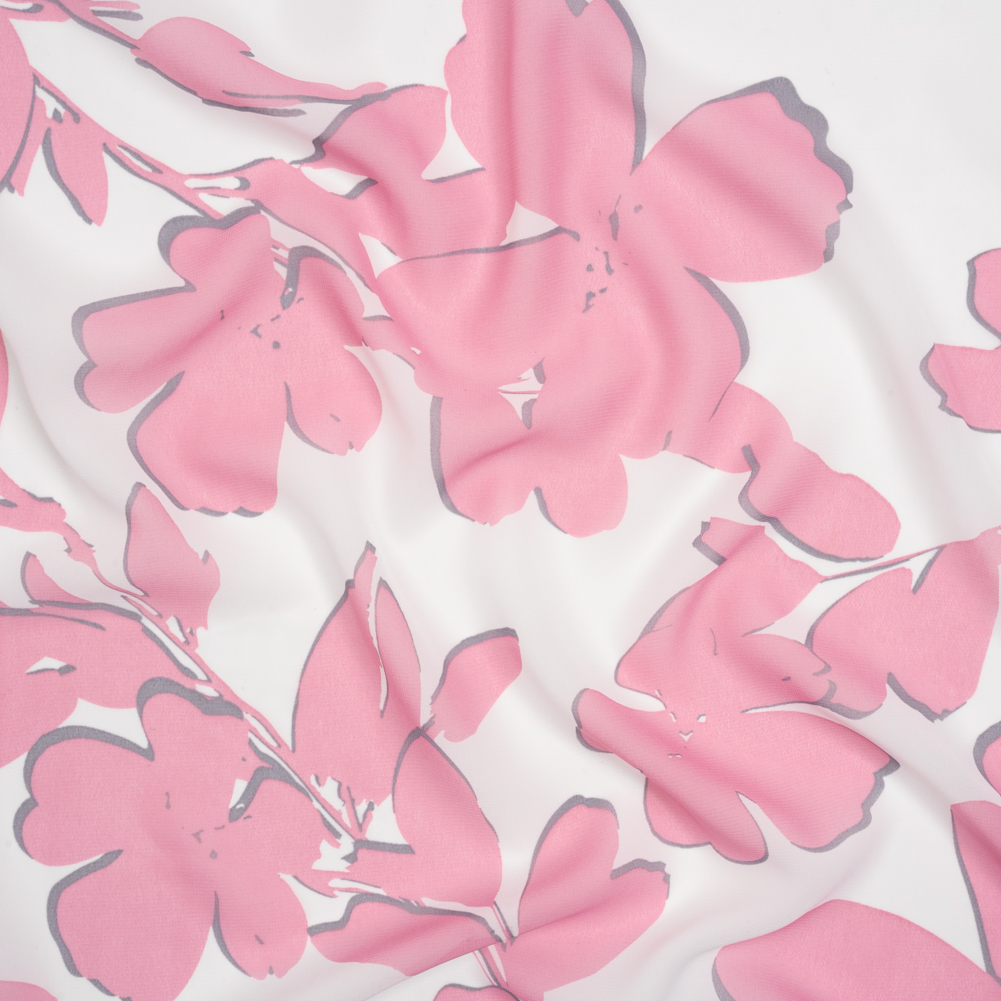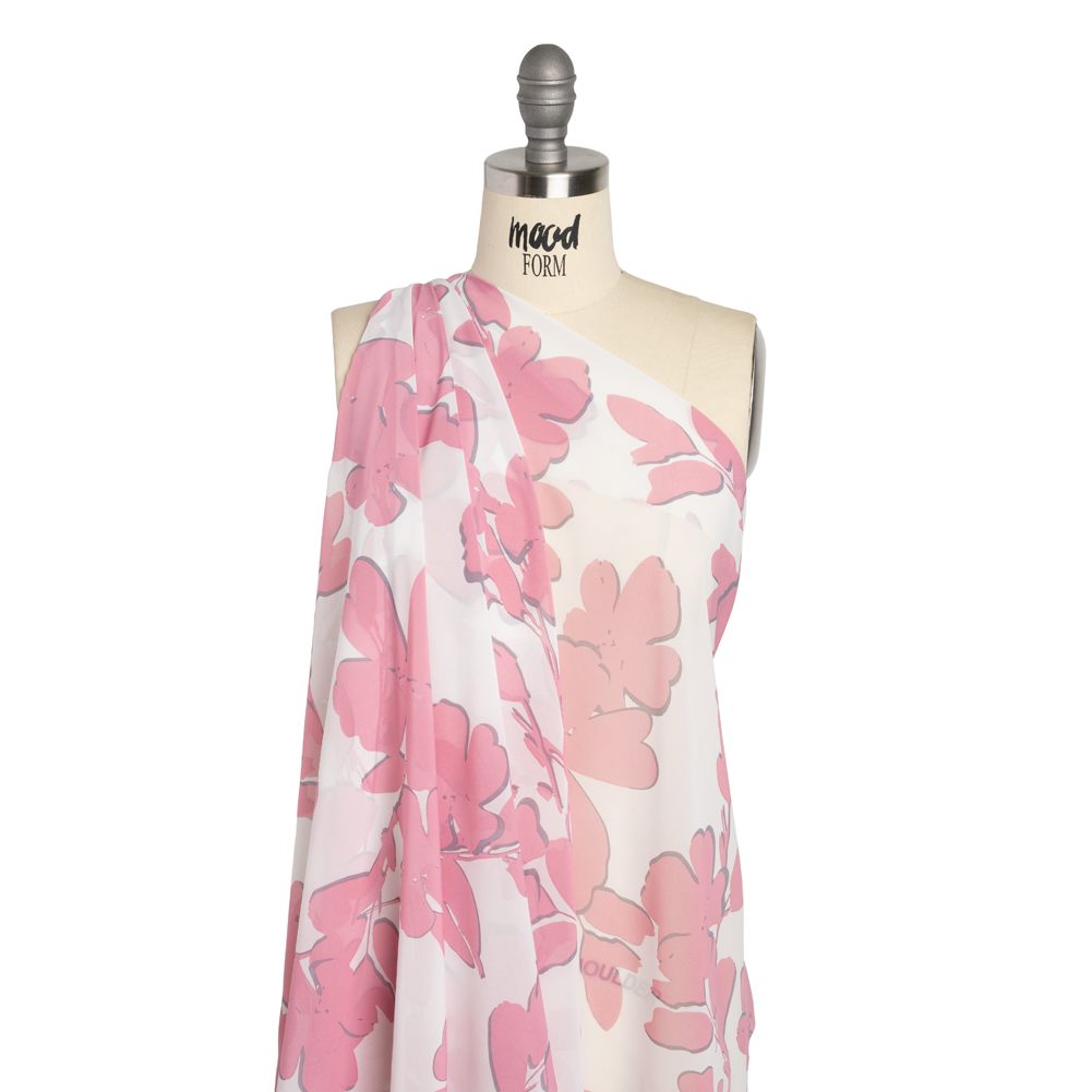 The feel of this Flowers and Leaves Polyester Chiffon is sure to bring a blush to your skin. Featuring an airy drape and grainy hand, ideal for carefree summer styles.Suggested Projects: Blouses, Dresses, Skirts, SleevesContent: 100% PolyesterStretch: NoneOpacity: SheerBlush pink flowers bloom atop a white background, casting pale gray shadows beneath them. A lightweight, easy drape accompanies a grainy hand, creating airy silhouettes and bringing texture to formal and semi-formal garments alike. With its fun pattern, blouses, ruffled dresses, and sheer puffed sleeves are only a few possibilities this glamorous fabric holds. Sheer, we suggest use with a lining, or layering over camis or slips.