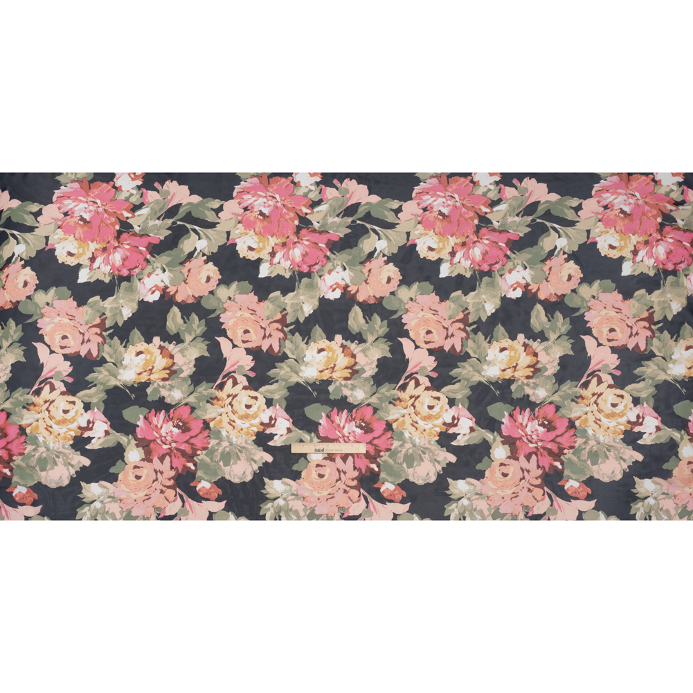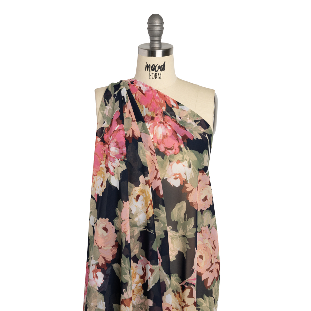 Polyester Chiffon - Midnight Navy, Sage Green and Blush Pink Roses - Designer Deadstock