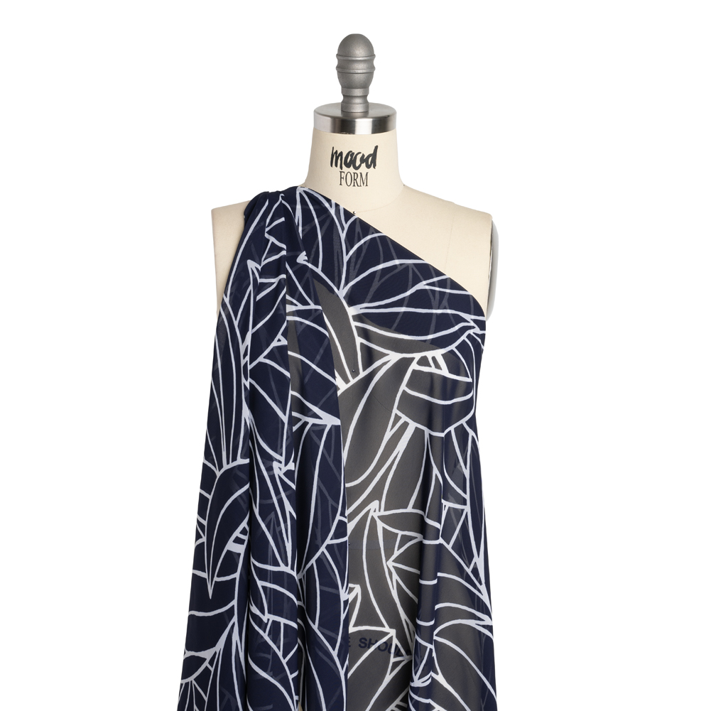 Polyester Chiffon - Navy Blue and White Overlapping Leaves - Designer Deadstock