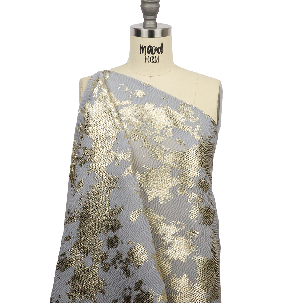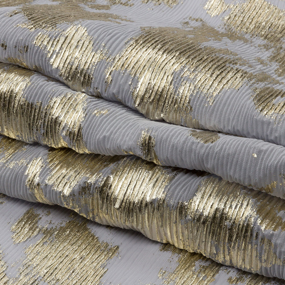Create something precious with this Aralia Gray and Gold Abstract Foiled Polyester Chiffon Plisse.