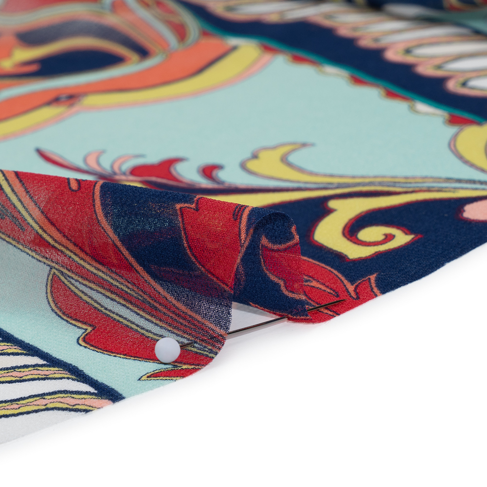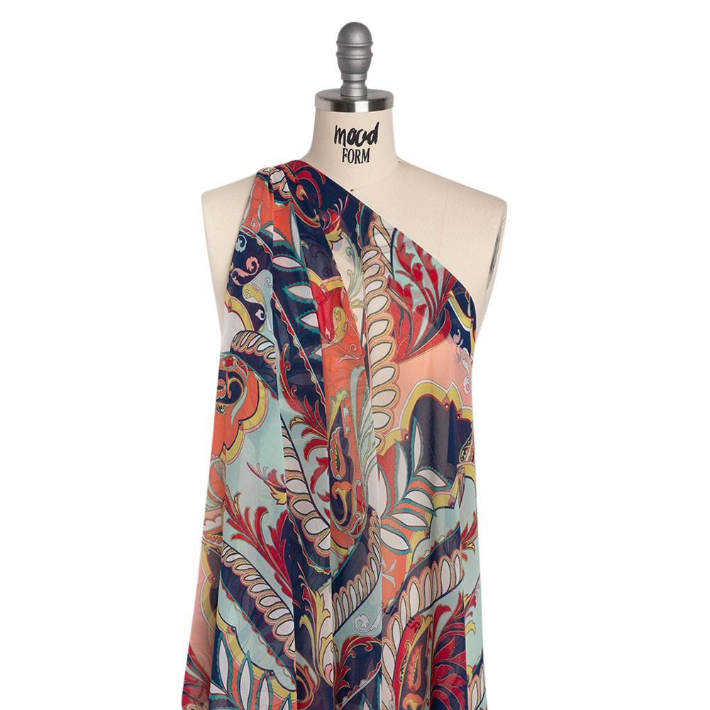 Ornate designs unfurl from this Paisley Leaves Polyester Chiffon Print—featuring a dry hand and airy drape.Suggested Projects: Dresses, Skirts, Shirts, BlousesContent: 100% PolyesterStretch: NoneOpacity: SheerA natural landscape of paisley leaves spreads across this chiffon in hues of navy, white, red, peach, mint, and teal. With a dry hand and airy drape, this sheer woven invites you to craft standout overlays for flowing summer dresses, ethereal evening gowns, breezy scarves, and romantic sheer blouses and skirts. With no stretch and a sheer finish, consider adding a lining for added opacity and structure depending on your design.