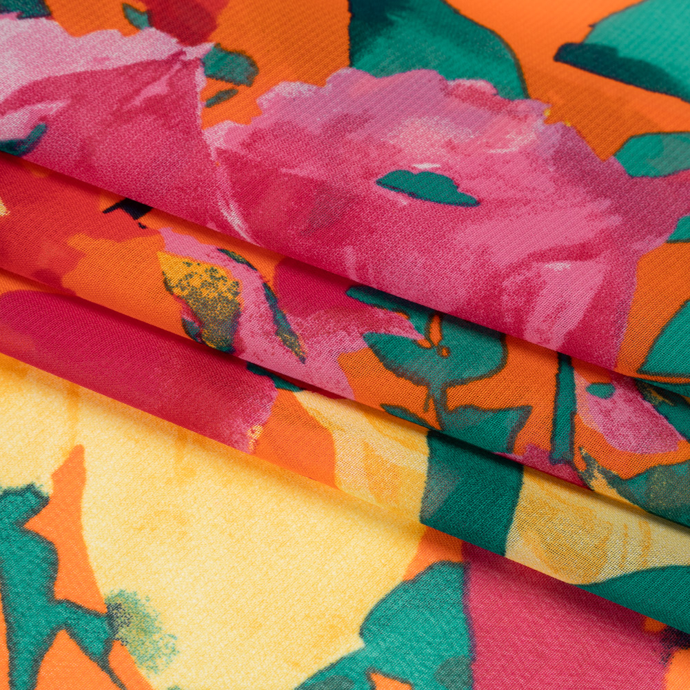 A spring sun sets on all of your designs with this Watercolor Flowers Polyester Chiffon Print, featuring a dry hand and fluid drape.Suggested Projects: Dresses, Skirts, Shirts, BlousesContent: 100% PolyesterStretch: NoneOpacity: SheerPink and yellow watercolor flowers are surrounded by their rich blue-green leaves, painted atop a bright orange ground. With a dry hand and fluid drape, design eye-catching overlays for evening gowns, flowing summer dresses, scarves, skirts, and sheer blouses. Sheer and without stretch, a lining may be added for opacity and structure where desired.