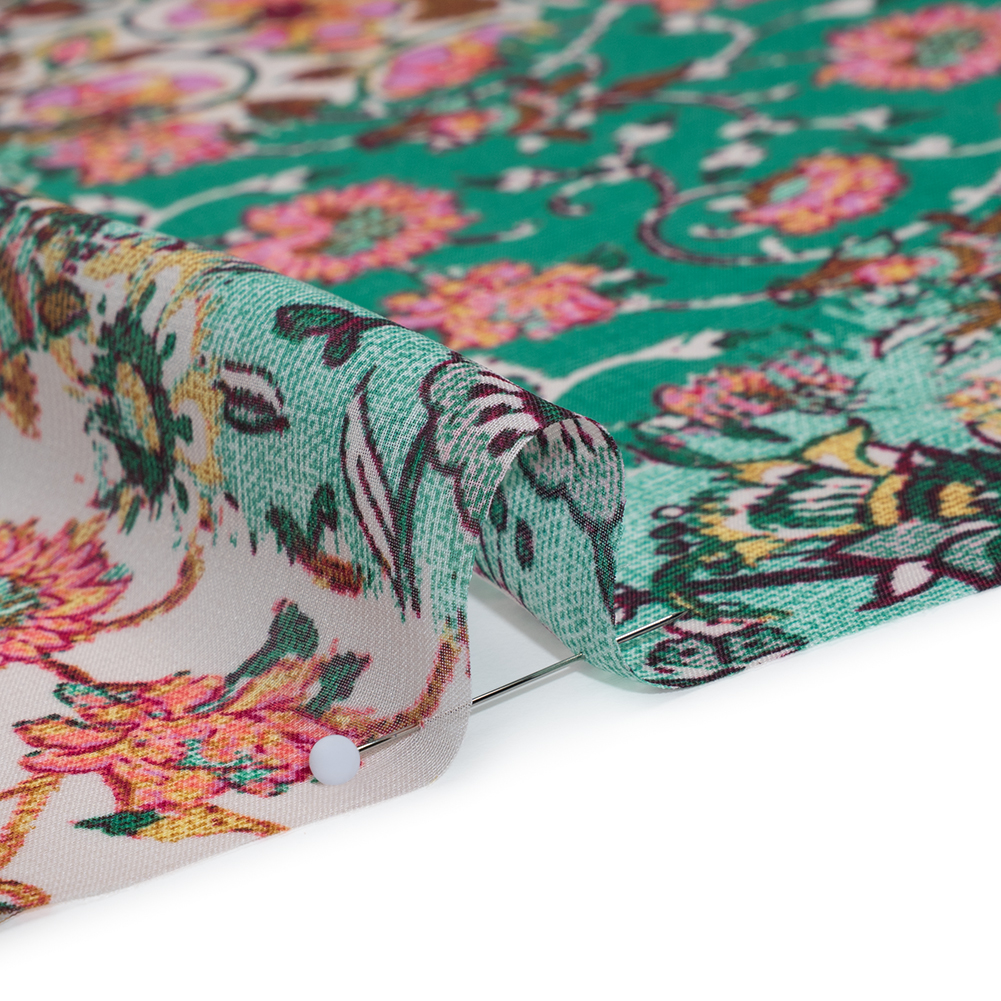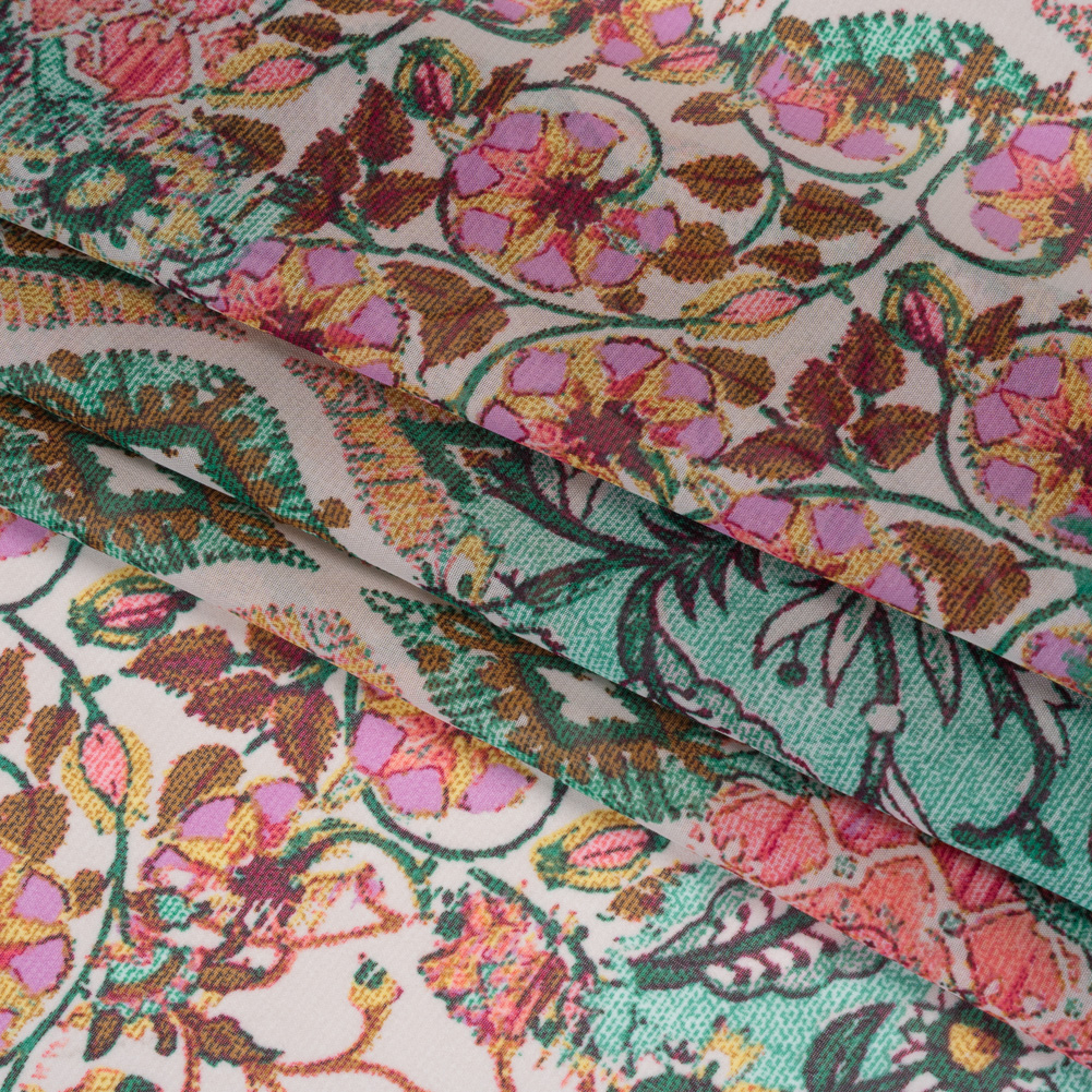 Mix it up with whimsy and flow in this Pink, Mint Green, and Yellow Floral Patchwork Polyester Chiffon, a breezy fabric that blends color, pattern, and movement with effortless charm.Suggested Projects: Dresses, Skirts, Shirts, BlousesContent: 100% PolyesterStretch: NoneOpacity: Semi-TranslucentCombining delicate florals with geometric tile motifs, this patchwork print brings a playful vintage spirit to a sheer, fluttery base. With its lightweight hand and gentle drape, it’s ideal for ruffled dresses, puff-sleeve blouses, gathered skirts, or layering tops that embrace both color and airiness. It sews best with sharp needles and a gentle touch, offering a soft challenge for those looking to elevate their spring or summer wardrobe. The semi-translucent finish allows for subtle layering while still catching the breeze with every step.
