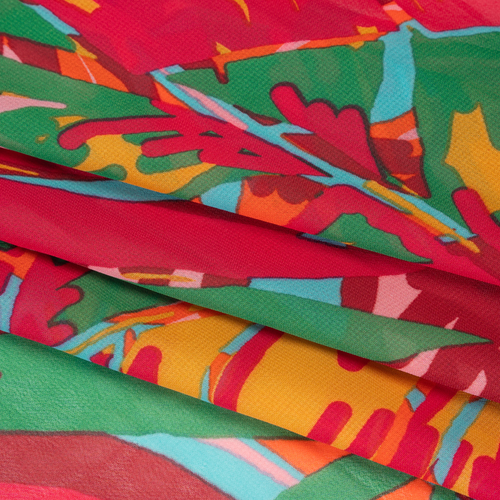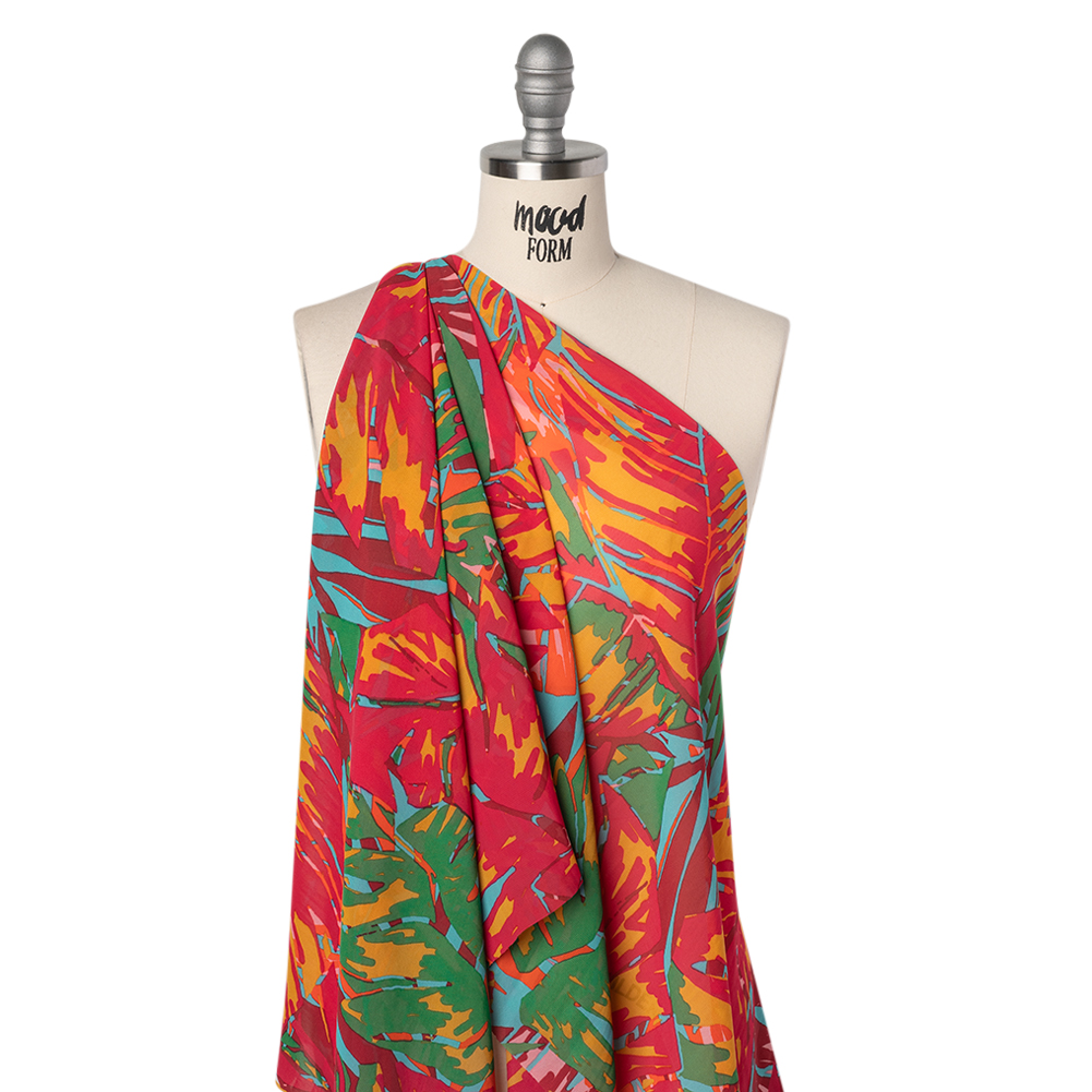 Leave your worries behind and jet off on a relaxing vacation with this Tropical Leaves Polyester Chiffon—featuring a dry hand and an airy drape.Suggested Projects: Dresses, Skirts, Shirts, BlousesContent: 100% PolyesterStretch: NoneOpacity: SheerTropical leaves burst to life in vibrant reds, raspberry pinks, emerald greens, sunny yellows, sky blues, and coral, each stroke laid down with playful, marker-like artistry. Lightweight with a dry, grainy hand and airy, graceful drape, this fabric is destined for ethereal overlays, sweeping layered evening gowns, floaty summer dresses, delicate scarves, and whisper-soft blouses. Sheer and without stretch, a lining may be added for opacity and form depending on your design.