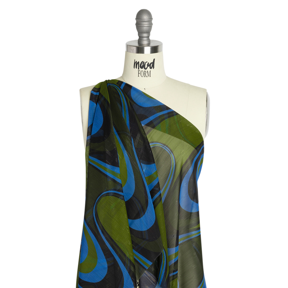 Fashion trends ebb and flow through history, but one thing’s for sure: a retro look will always have a spot in our wardrobe! Inspired by the 1970s, this Mood Exclusive Blue Ebb and Flow Metallic Pinstriped Polyester Chiffon will sweep you up in its tide! Green, blue, and navy oblong waves flow across the face as lustrous pinstripes run parallel to the selvages.