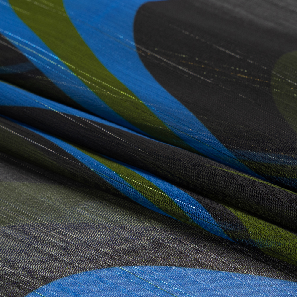 Polyester Chiffon Print with Metallic Pinstripes – Blue, Green and Black Waves – Mood Exclusive Ebb and Flow