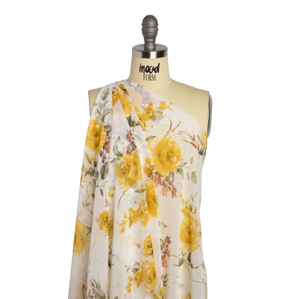 This Roses Polyester Chiffon will rise on the spring breeze. Featuring an airy drape and grainy hand, ideal for carefree summer styles.Suggested Projects: Blouses, Dresses, Skirts, SleevesContent: 100% PolyesterStretch: NoneOpacity: SheerRich mustard yellow and dark pink roses bloom along delicate sage green stems and flowers atop a bright white ground. A lightweight, easy drape accompanies a grainy hand, creating airy silhouettes and bringing texture to formal and semi-formal garments alike. With its fun pattern, blouses, ruffled dresses, and sheer puffed sleeves are only a few possibilities this glamorous fabric holds. Sheer, we suggest use with a lining, or layering over camis or slips.