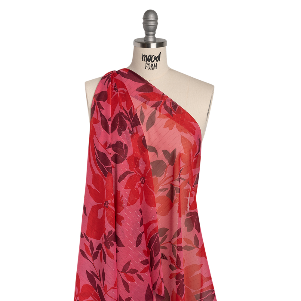 Catch the eye of all onlookers in this Floral Polyester Chiffon with Metallic Pinstripes—featuring a dry hand and airy drape.Suggested Projects: Dresses, Skirts, Shirts, BlousesContent: 100% PolyesterStretch: NoneOpacity: SheerRed and burgundy flowers and leaves bloom against a dark pink background, the entire design shimmering thanks to thin metallic pinstripes racing across the length. With a dry hand and airy drape, this sheer woven invites you to craft standout overlays for flowing summer dresses, ethereal evening gowns, breezy scarves, and romantic sheer blouses and skirts. With no stretch and a sheer finish, consider adding a lining for added opacity and structure depending on your design.