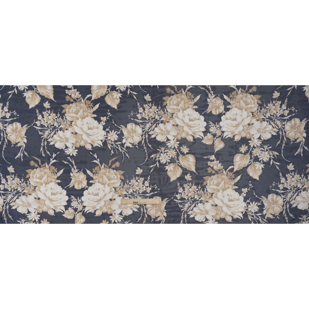 Polyester Chiffon with Puffy Print - Navy, Ivory and Tan Floral - Designer Deadstock