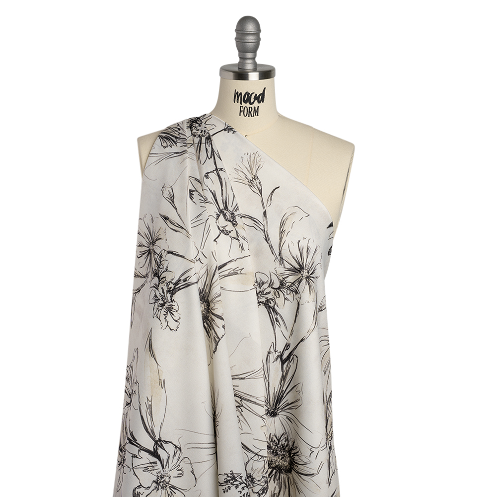 Preserve the memory of your springtime hike with our Mood Exclusive Illustrated Herbarium Polyester Crepe-Back Satin—featuring a smooth hand, slight luster, and billowing drape.Suggested Projects: Shirts, Pants, Dresses, SkirtsContent: 100% PolyesterStretch: NoneOpacity: Slightly TranslucentRather than plucking the delicate flowers and plants you encounter on your walk, our Illustrated Herbarium print lets you treasure them without the fear of wilting. Against an off-white canvas, wildflowers and stems are sketched in bold charcoal lines—capturing the essence of a botanical garden that will stay with you for years to come. In stark contrast with the matte, grainy reverse, the face boasts a smooth hand and slight luster. To emphasize the full-bodied drape, create billowing summer gowns and maxi skirts with the satin side, or achieve a more casual style with patterned camp shirts and wide-legged pants. Slightly translucent, we recommend adding a lining for opacity and a luxurious finish.